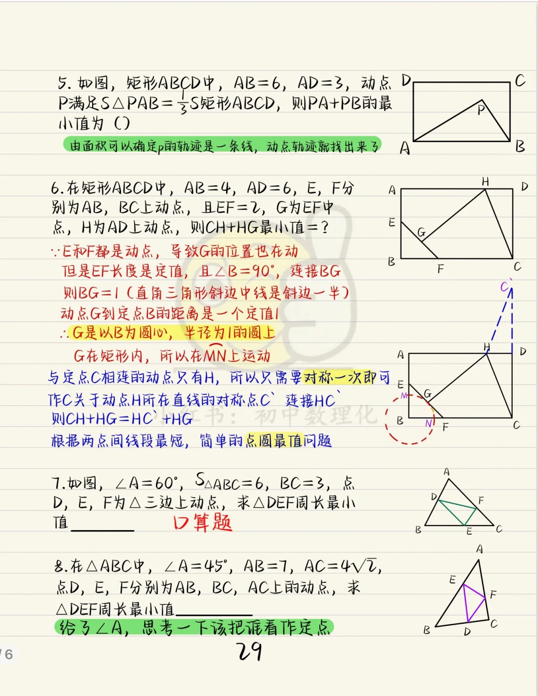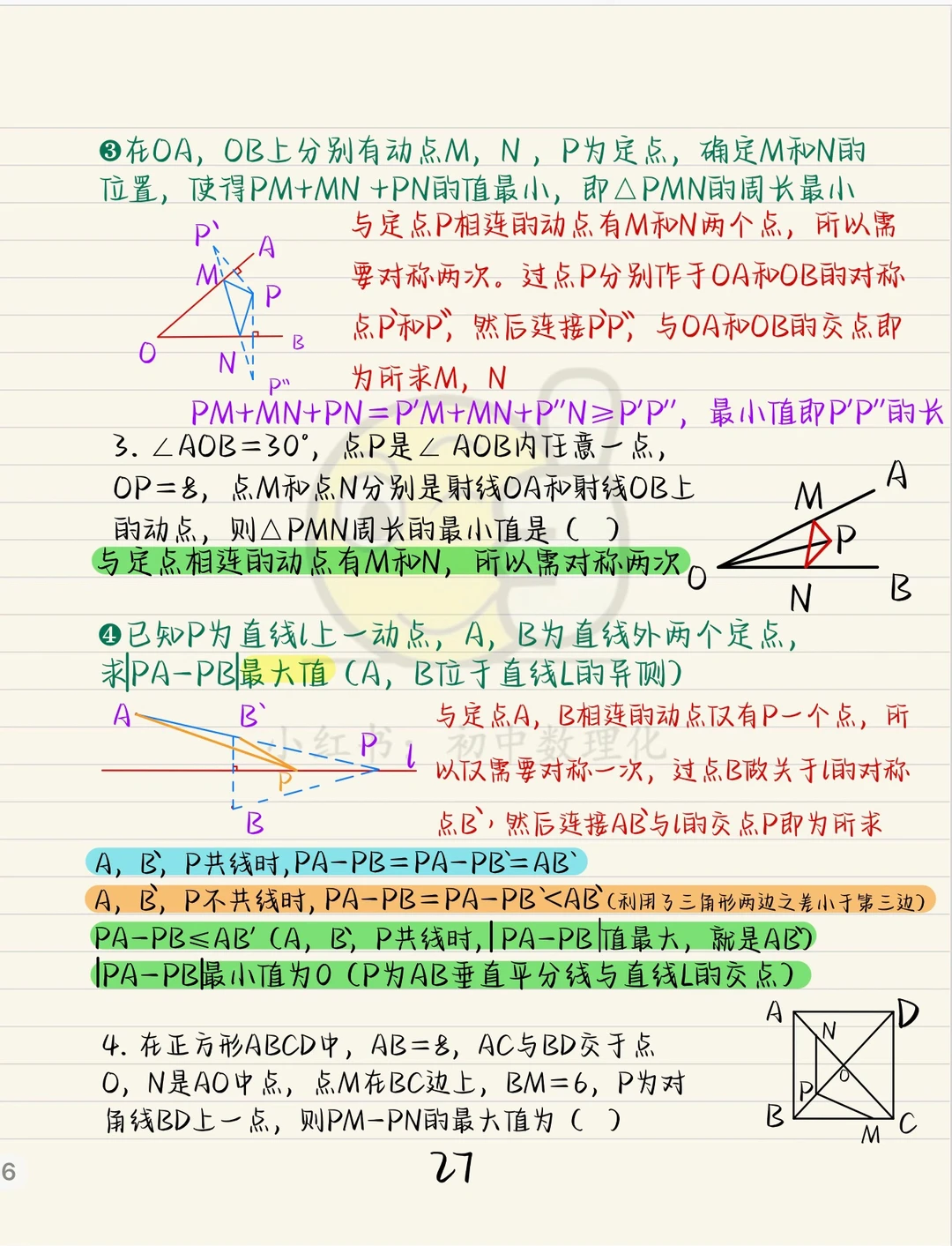 将军饮马模型,核心关键是作辅助线,如何做,做几条。 与定点相连的动点有几个就做几次辅助线。 求和一般求最小值,将点转化到线的两侧,利用两点之间线段最短,点到直线垂线段最短来做题。 求差一般求最大值,将点转化到线的同侧,利用三角形两边之差小于第三边。