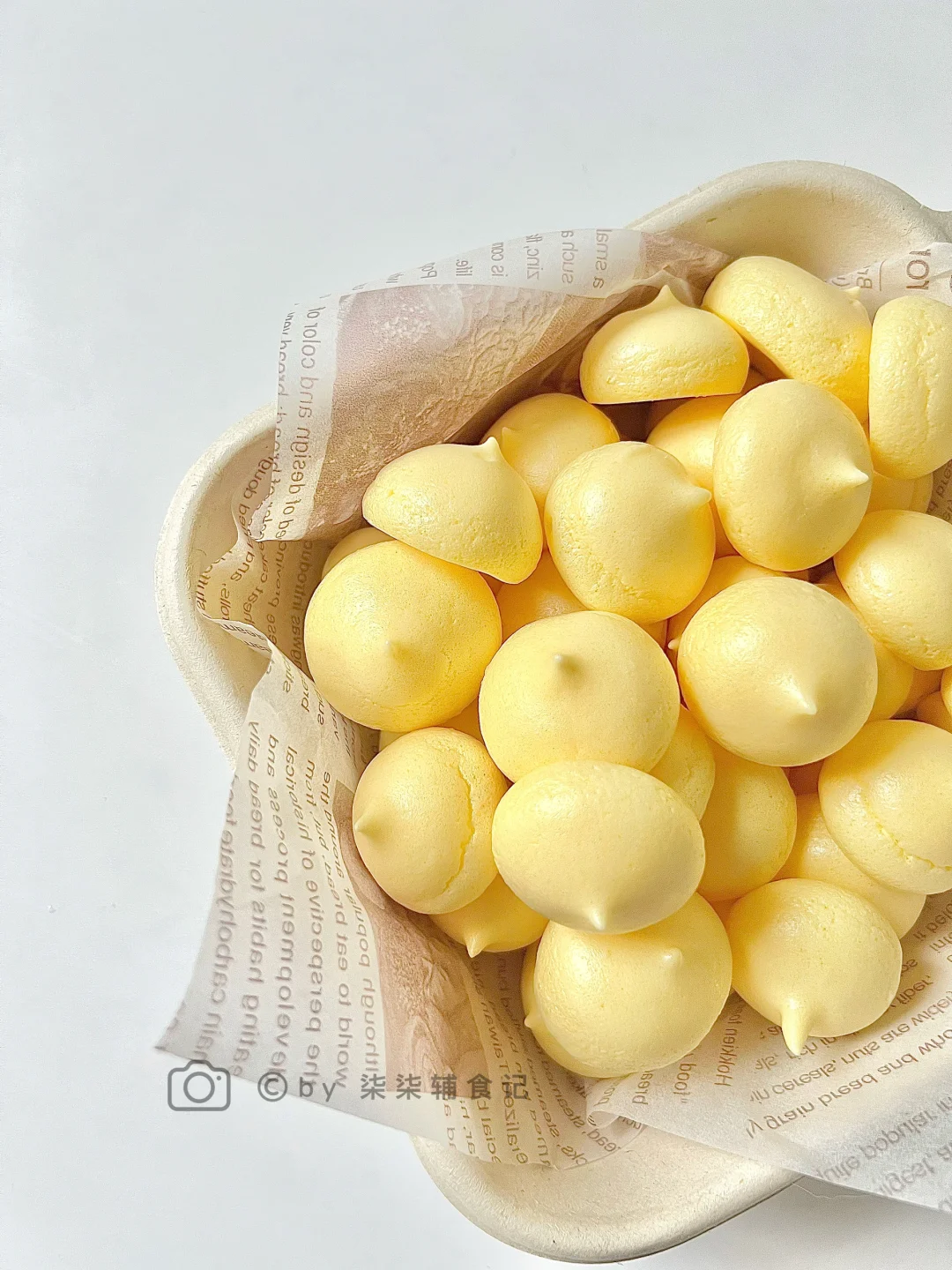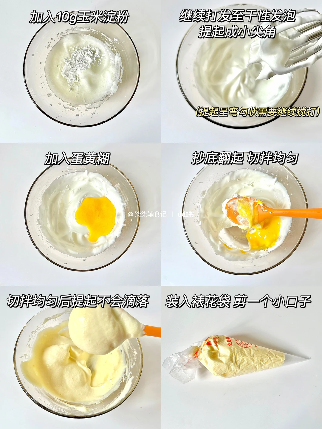 ▫️蛋白加几滴柠檬打发至有纹路,加入玉米淀粉继续打发至干性发泡状态,提起呈小尖角