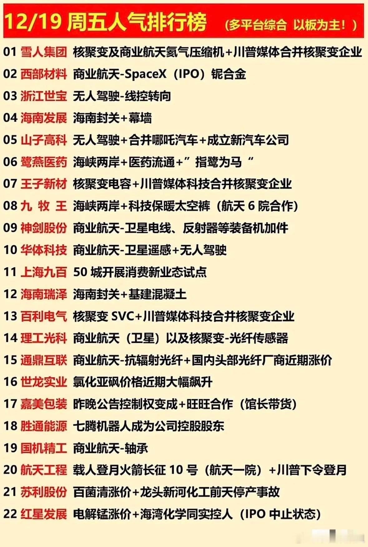 12/19人气排行榜梳理分析今日人气榜覆盖核聚变、商业航天、无人驾驶、海南封关等主线赛道,同时包含涨价、股权变更、停产事故等事件驱动型题材;个股题材多呈现交叉属性,且频繁绑定川普相关、载人登月等市场热点事件,反映资金对题材联动性和事件催化的高度关注,人气炒作以“赛道+事件”的组合逻辑为主。1. 雪人集团:位列人气榜首位,主打核聚变及商业航天氦气压缩机,还叠加川普媒体合并核聚变企业的事件催化。作为核聚变赛道核心标的,多重题材共振推高其市场人气,是当日题材炒作的核心龙头之一。2. 西部材料:聚焦商业航天赛道,关联SpaceX铌合金业务,铌合金是航天领域关键材料,依托SpaceX的IPO预期及商业航天产业热度,成为该细分领域的人气标的,获资金重点关注。3. 浙江世宝:主打无人驾驶-线控转向题材,线控转向是无人驾驶核心技术环节,是实现车辆智能控制的关键,凭借无人驾驶赛道热度与技术稀缺性,跻身人气榜前列。4. 海南发展:紧扣海南封关题材,同时涉及幕墙业务,海南封关是区域发展重要政策节点,幕墙业务与海南基建、地产配套相关,政策预期下成海南板块人气代表标的之一。5. 山子高科:布局无人驾驶赛道,叠加合并哪吒汽车、成立新汽车公司的产业动作,既受益于无人驾驶赛道热度,又因车企整合事件获得额外关注度,人气快速提升。6. 鹭燕医药:主打海峡两岸+医药流通题材,还因“指鹭为马”的趣味梗增加话题性,医药流通是医药板块基础赛道,叠加区域题材,事件与题材结合推高其人气。7. 王子新材:涉及核聚变电容题材,关联川普媒体科技合并核聚变企业的事件,电容是核聚变设备核心部件,事件催化下成为该赛道的人气跟风标的。8. 九牧王:叠加海峡两岸+科技保暖太空裤题材,还与航天6院合作,科技保暖太空裤结合航天技术,实现消费与航天赛道跨界融合,区域题材进一步丰富其炒作逻辑。9. 神剑股份:聚焦商业航天赛道,主营卫星电线、反射器等装备机加件,是商业航天产业链配套环节,为卫星制造提供核心零部件,依托产业风口成细分领域人气标的。10. 华体科技:同时布局商业航天-卫星遥感与无人驾驶两大热门赛道,卫星遥感是商业航天重要应用方向,与无人驾驶形成题材共振,双重赛道加持下关注度显著提升。11. 上海九百:受益于50城开展消费新业态试点的政策驱动,作为上海本地消费标的,聚焦消费新业态布局,政策利好叠加区域属性,成消费板块人气代表。12. 海南瑞泽:紧扣海南封关题材,主营基建混凝土业务,海南封关将带动区域基建发展,混凝土作为基建核心材料直接受益,成为海南板块的人气标的。13. 百利电气:主打核聚变SVC题材,叠加川普媒体科技合并核聚变企业的事件,SVC是核聚变关键设备,事件与赛道热度结合,使其成核聚变板块重要人气标的。14. 理工光科:布局商业航天及核聚变-光纤传感器题材,光纤传感器是两大赛道核心元器件,跨赛道技术布局让其获得资金和市场的双重关注。15. 通鼎互联:聚焦商业航天-抗辐射光纤题材,同时是国内头部光纤厂商且近期光纤涨价,抗辐射光纤是航天通信关键材料,叠加涨价的业绩驱动,题材与基本面共振推高人气。16. 世龙实业:因氯化亚砜价格近期大幅飙升获关注,氯化亚砜是化工重要原料,价格上涨直接利好公司业绩,属于涨价驱动型标的,成化工板块人气股。17. 嘉美包装:因昨晚公告控制权变更,且与旺旺合作、叠加馆长带货的直播电商题材,控制权变更带来业务布局预期变化,合作与带货打开消费渠道想象空间。18. 胜通能源:因七腾机器人成为公司控股股东引发关注,机器人是热门赛道,控股股东变更意味着公司或向机器人领域转型,产业转型预期成人气提升核心驱动。19. 国机精工:聚焦商业航天-轴承业务,轴承是航天装备核心零部件,商业航天发展带动航天轴承需求,依托细分领域技术优势,成商业航天板块人气标的。20. 航天工程:关联载人登月火箭长征10号,还叠加川普下令登月的事件催化,载人登月是航天重大事件,长征10号是核心装备,事件与产业结合使其人气高涨。21. 苏利股份:因百菌清涨价,且龙头新河化工前天停产事故进一步助推价格上行,百菌清是农药重要产品,停产导致供给收缩,业绩预期驱动其成农业化工板块人气股。22. 红星发展:因电解锰涨价,且海湾化学同实控人带来关联预期,电解锰是新能源、冶金重要原料,价格上涨叠加关联事件,使其成资源板块人气标的。总结本次人气榜个股围绕核聚变、商业航天、无人驾驶等主线赛道展开,同时叠加政策、事件、涨价等多重催化,题材呈现“赛道+事件”的联动特征;部分标的还实现跨赛道、跨领域的题材融合,反映当下市场资金偏好热点题材与事件驱动的结合,投资者需关注题材持续性与基本面的匹配度,规避纯题材炒作的短期波动风险。股市有风险 投资需谨慎!A股