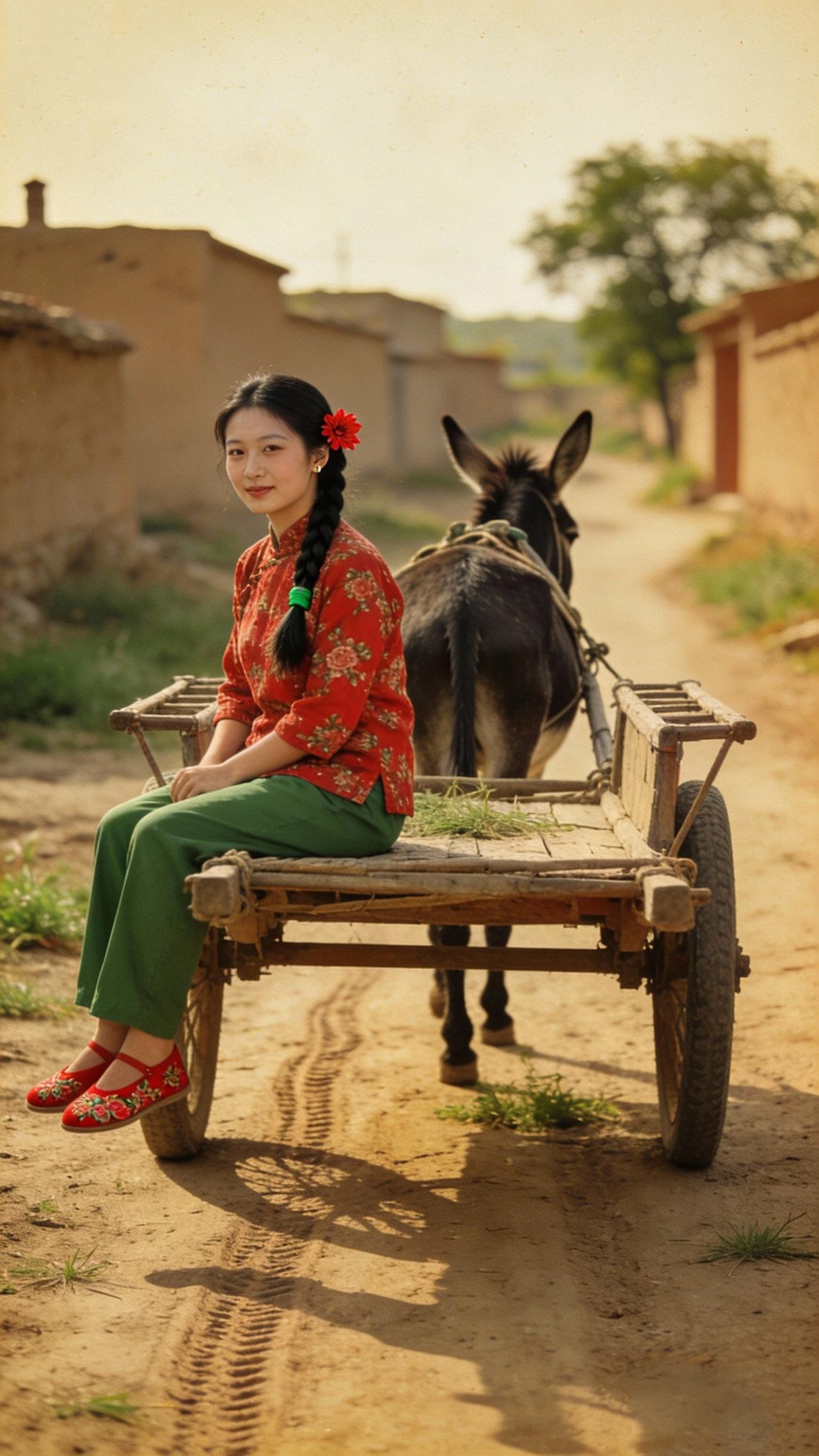 《塬上驴车》 土径尘轻映夕光, 红衫绿袂坐车旁。 驴蹄慢踏乡关路, 一朵榴花绾辫香。 赏析:这首小诗以陕北乡村的驴车、红衣女子为核心意象,先以“土径尘轻映夕光”铺展黄昏时分黄土小路的暖调背景,营造出悠然的乡土氛围;次句“红衫绿袂坐车旁”捕捉人物服饰的鲜明色彩,红与绿的对比让形象鲜活夺目;后两句中,“驴蹄慢踏乡关路”以慢节奏的动作写乡村生活的闲适,“一朵榴花绾辫香”则以发间红花的细节,为画面添上灵动的一抹艳色,还化视觉为嗅觉,让乡土风情更具韵味。全诗语言质朴自然,将地域特色与人物情态相融,勾勒出陕北乡村里悠然美好的生活瞬间。驴背上的风景 陕北驴车 黄土毛驴图 乡村驴车游