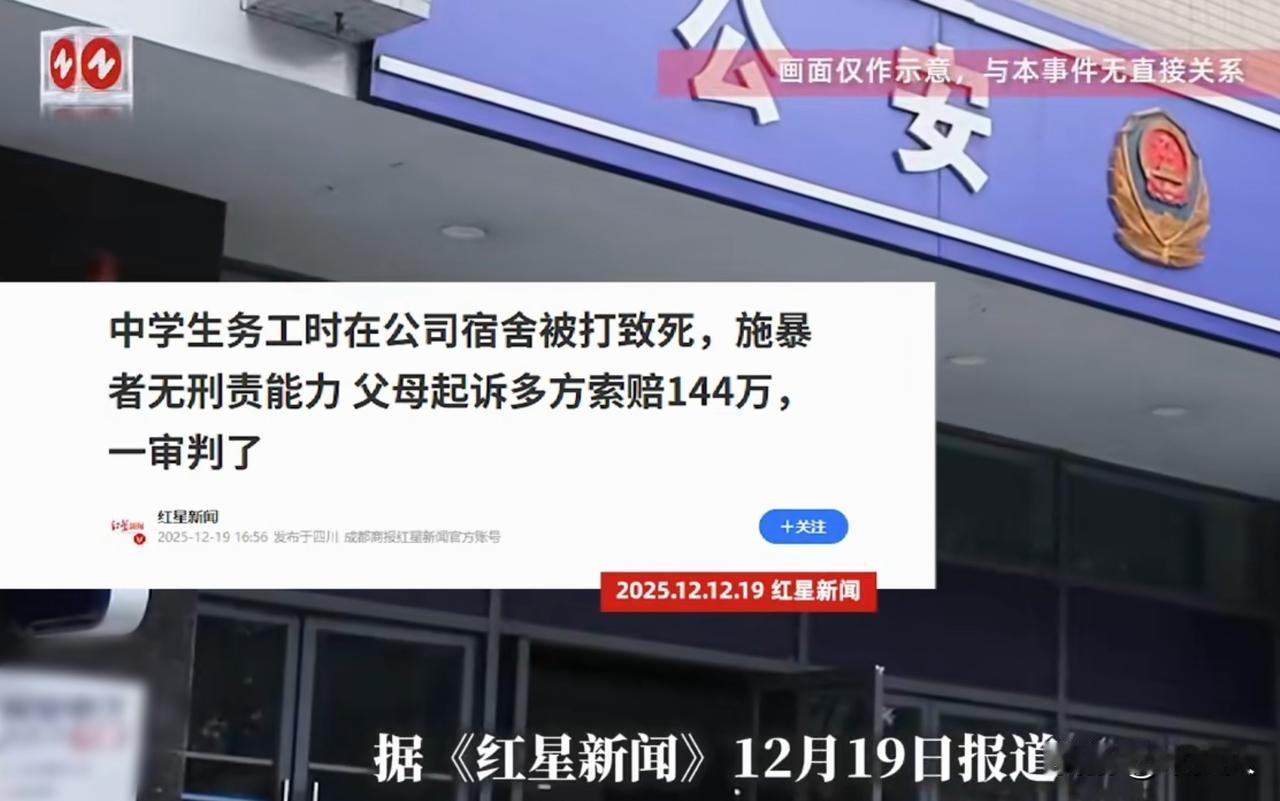 江苏海安,17岁男孩实习务工,被舍友暴力致死,经鉴定,案发时舍友属于精神疾病发病期,无刑责能力,不构成犯罪。公司一次性赔偿男孩家属166000元,男孩父母承诺不再向公司主张其他权利。之后男孩父母将舍友父母告上法庭,索赔144万余元,并要求公司、学校和中介公司承担补充赔偿责任,法院判了。 小吴是山西某中学的学生,2023年6月,学校组织小吴去苏州一家公司实习,实习期为2023年6月5日到11月10日。 2023年9月11日,小吴跟实习公司提出离职,并选择外出进厂务工。 学校通知小吴家长到学校签署了安全保证承诺书,承诺书的内容大致为:小吴以看病为由办理请假,小吴在校外的安全问题与学校无涉等。 跟学校沟通好后,小吴通过资源公司,通过劳务派遣的方式,成功入职了一家新公司开始务工。 小吴在这家公司工作了3个多月,一直都好好的。 2023年12月31日凌晨4点,小吴在宿舍休息,突然遭到了同宿舍刘某的暴力袭击。 刘某先是击打小吴的头部,之后将小吴从床上拖拽到地上后,继续施暴,用脚踩踏小吴颈部,等其他人发现并报警后,小吴已经当场死亡。 经鉴定,小吴系左颈部受打击,导致颈动脉窦区损伤后心跳骤停死亡。 公司通知了小吴父母,小吴父母从山西赶到江苏处理孩子的身后事。 中年丧子,小吴父母悲痛欲绝,也很愤怒,自己好好的孩子,在公司上着班,怎么就没了呢? 后经司法鉴定,事发时刘某属于精神疾病发病期,无刑责能力,不构成犯罪,无需承担刑事责任。 《刑法》第18条规定:精神病人在不能辨认或者不能控制自己行为的时候造成危害结果,经法定程序鉴定确认的,不负刑事责任,但是应当责令他的家属或者监护人严加看管和医疗;在必要的时候,由政府强制医疗。 之后,刘某被强制医疗。 后经调解,涉事公司向小吴父母一次性支付补偿款166000元,小吴父母承诺不再向公司主张协议以外的其他权利。 虽然得到了公司的赔偿,但是小吴的父母认为是刘某的暴力行为导致自己儿子死亡,刘某及其监护人更应该承担民事赔偿责任。 他们将刘某的监护人告上法庭,要求对方赔偿丧葬费、死亡赔偿金、精神损害抚慰金、交通费等144万余元,并要求公司、学校和3家资源公司一起承担补充赔偿责任。 《民法典》第1188条规定:无民事行为能力人、限制民事行为能力人造成他人损害的,由监护人承担侵权责任。监护人尽到监护职责的,可以减轻其侵权责任。 因案发时刘某处于发病阶段,无需承担刑事责任,但是民事赔偿责任不能豁免。 刘某的暴力行为直接导致了小吴的死亡,刘某的父亲作为监护人,需要承担赔偿责任。 一审法院判决刘某父亲赔偿小吴父母死亡赔偿金、丧葬费、精神损害抚慰金、交通费等共计144万余元。 小吴的父母还要求事发所在公司、学校和3家资源公司承担补偿赔偿责任。 《民法典》第1165条规定:行为人因过错侵害他人民事权益造成损害的,应当承担侵权责任。 员工在宿舍被其他发病的员工暴力致死,如果公司作为宿舍管理方,未尽到合理的安全保障义务或者管理职责,可能需要承担相应的赔偿责任。 比如公司明知或者应知该员工有精神疾病或者行为异常风险,但是未采取合理措施,从而未能防止伤害发生,公司可能因过错需要承担部分赔偿责任。 因事发后小吴的父母跟事发公司签了调解协议,对方赔偿166000元给小吴父母,小吴父母承诺不再主张其他任何权利,该协议是双方自愿签订,真实意思的表示,合法有效。 法院驳回了小吴父母要求公司承担补偿赔偿责任的诉求。 至于学校,因小吴实习结束后,家属签署了安全保证承诺书,小吴的死亡发生在校外,学校已经履行了安全管理义务,不存在过错,无需承担责任。 至于3家资源公司,他们只是起到了劳务派遣的作用,与案涉侵权行为无关,无需承担补偿责任。 最终,一审法院判决刘某父亲赔偿小吴父母144万余元,驳回其他诉求。