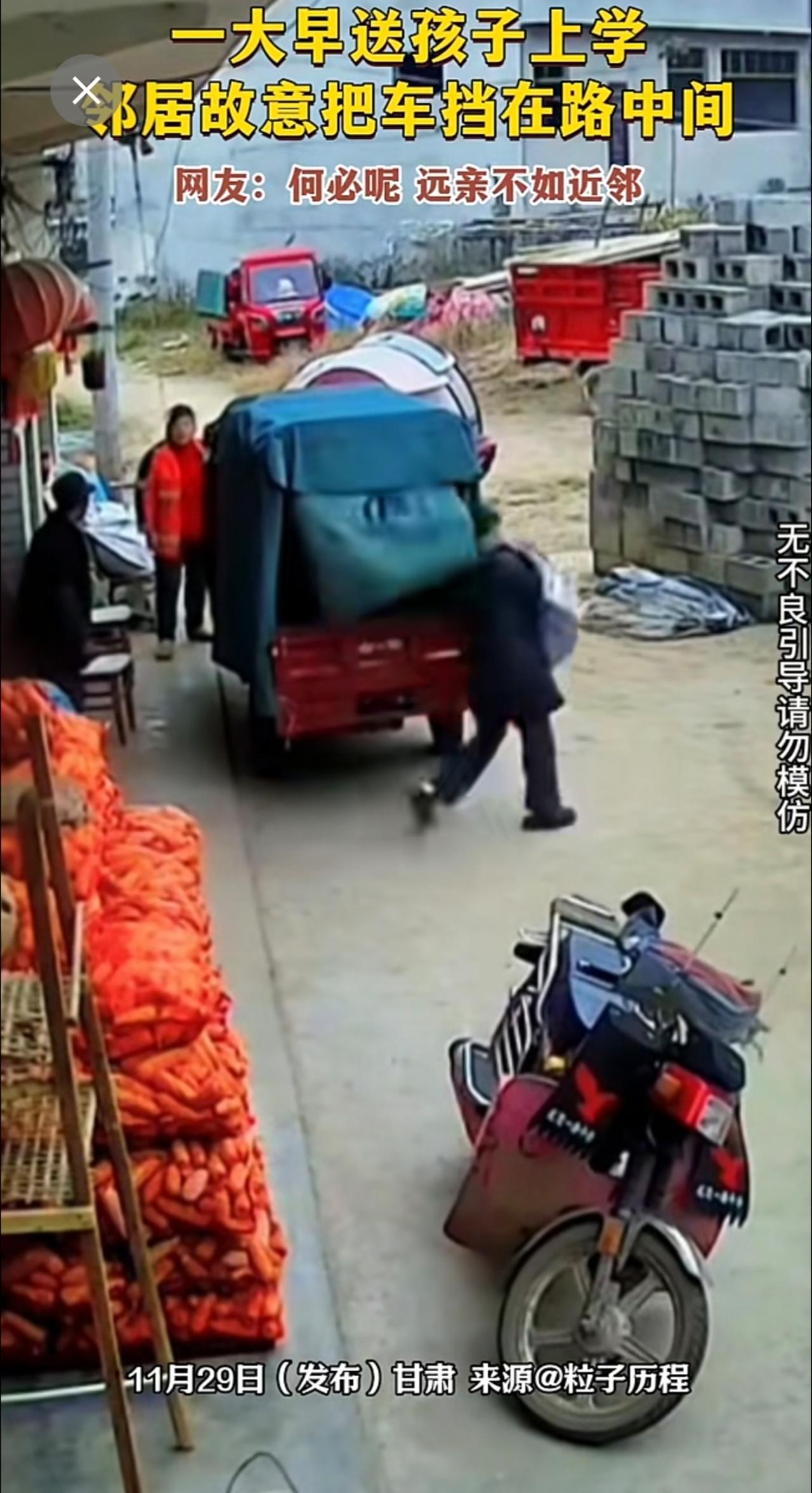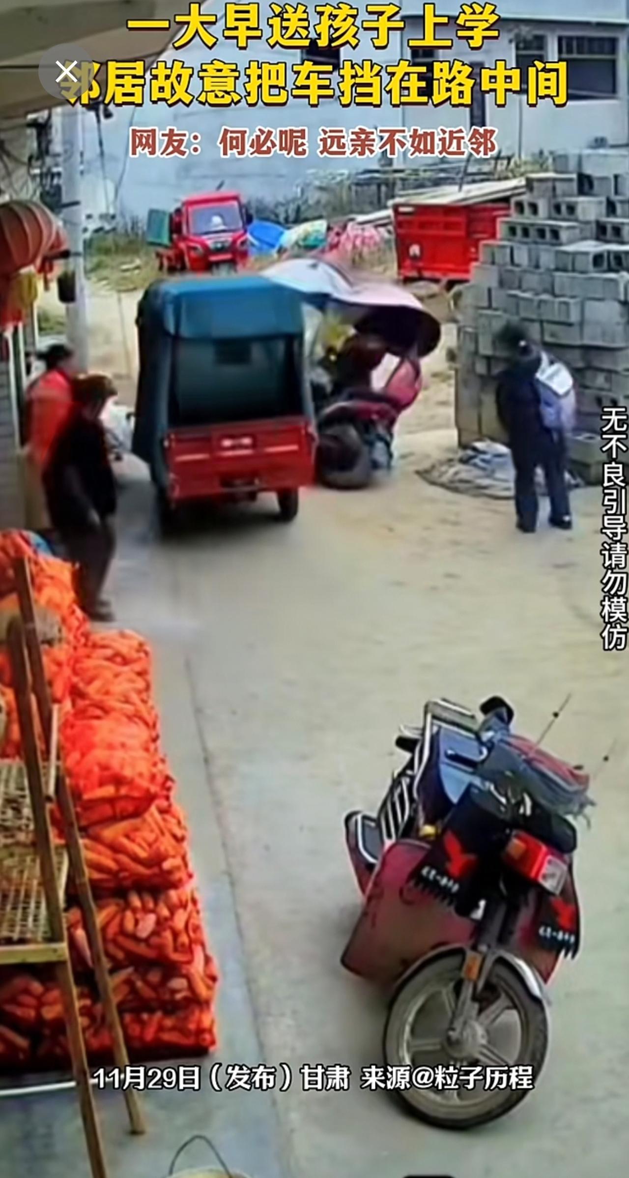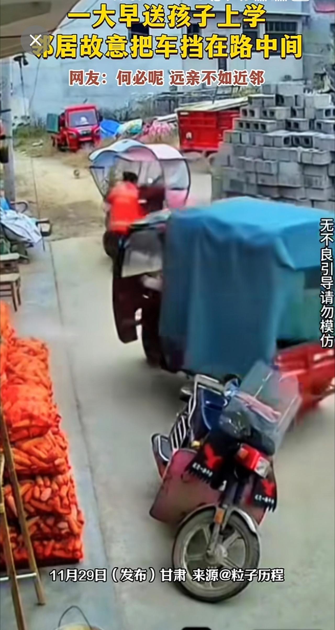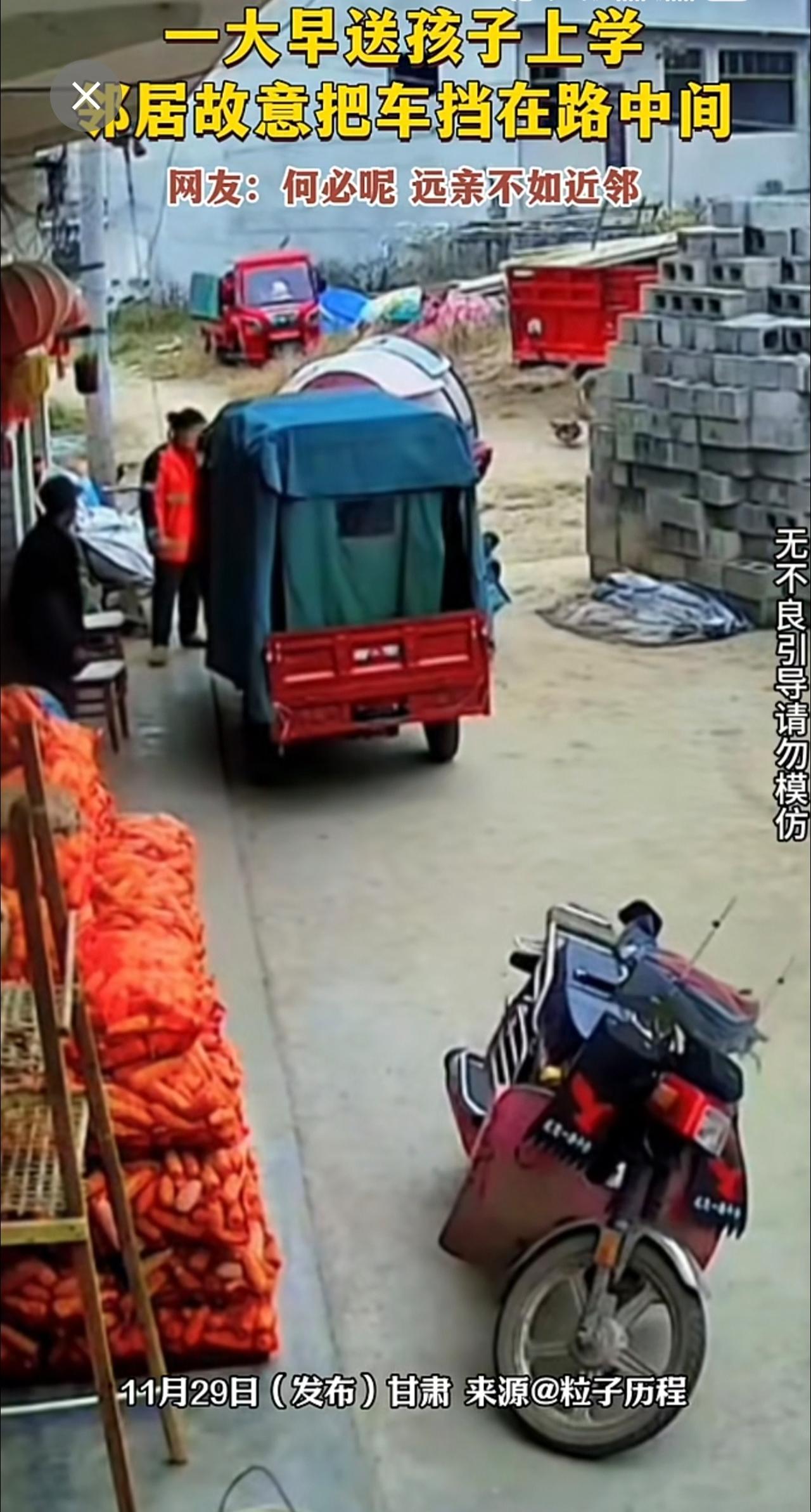 一大早送孩子上学,邻居故意把车挡在路中间。