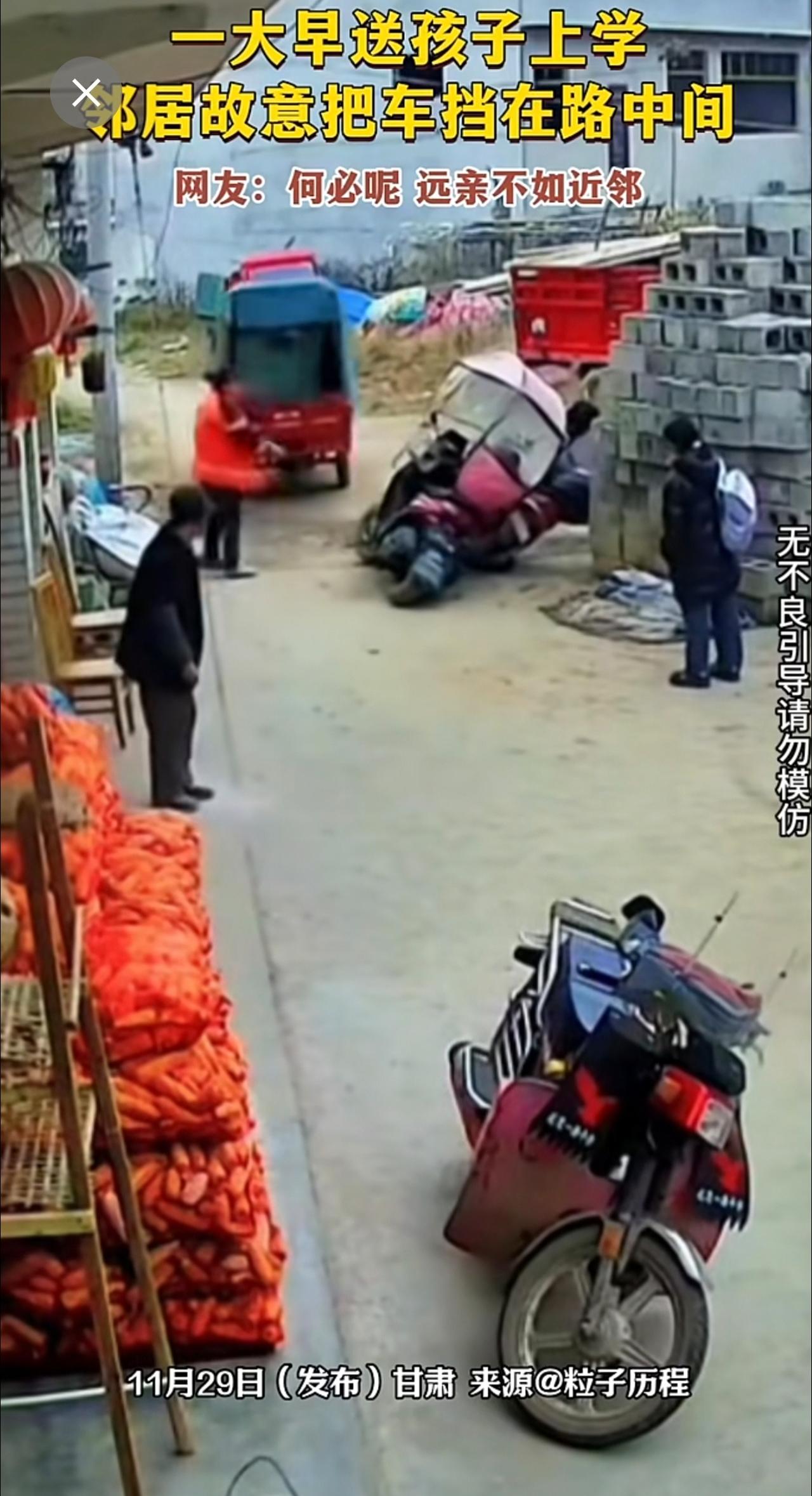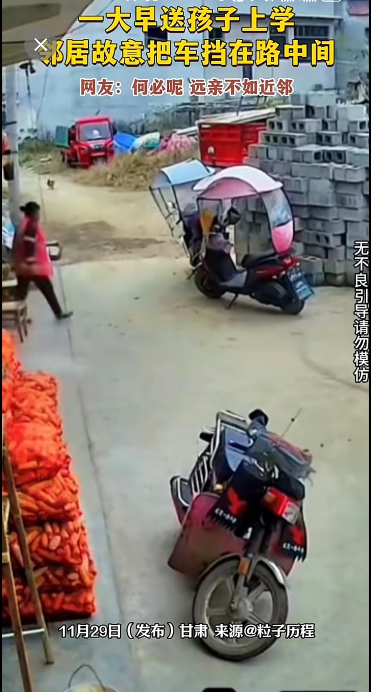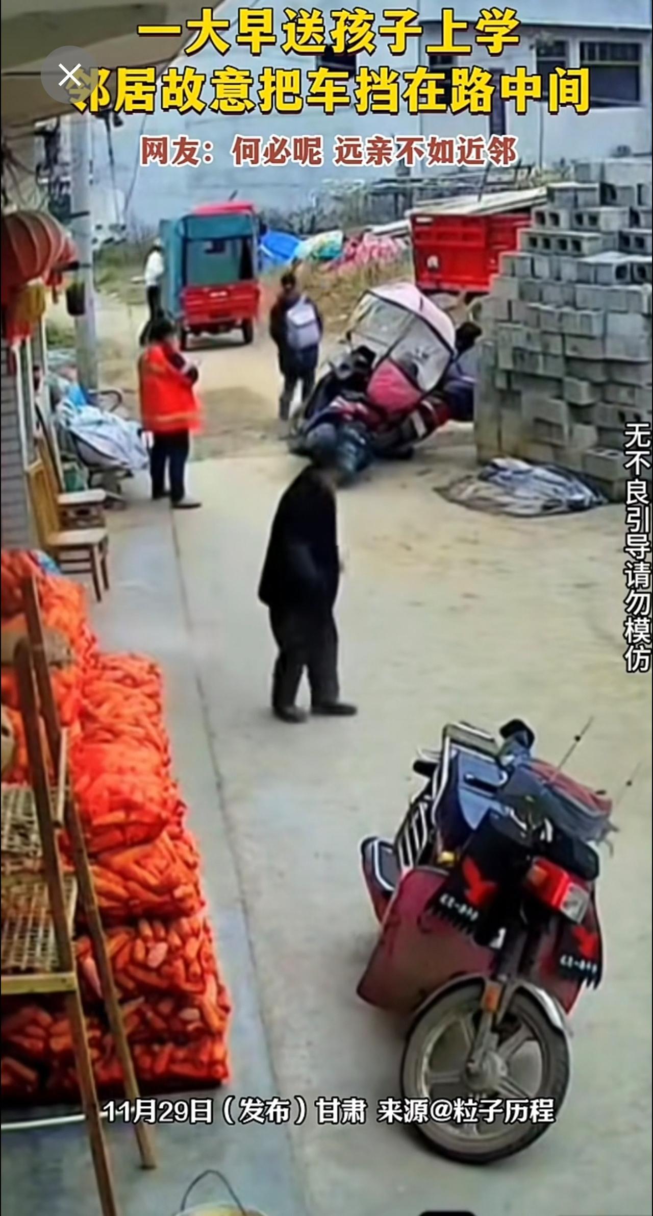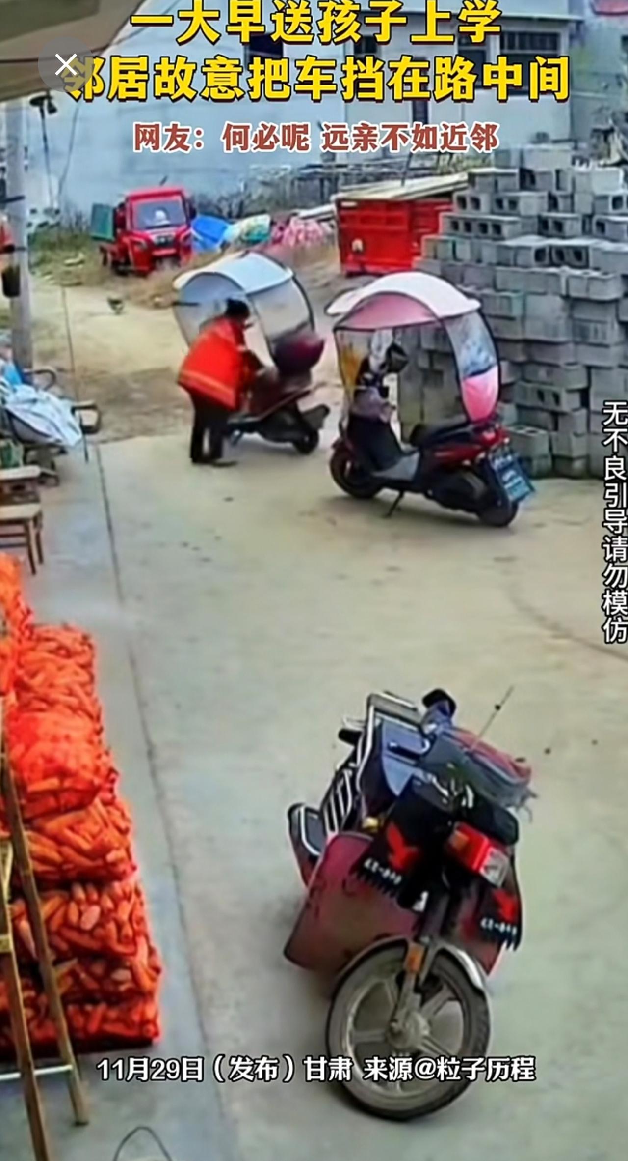 一大早送孩子上学,邻居故意把车挡在路中间。