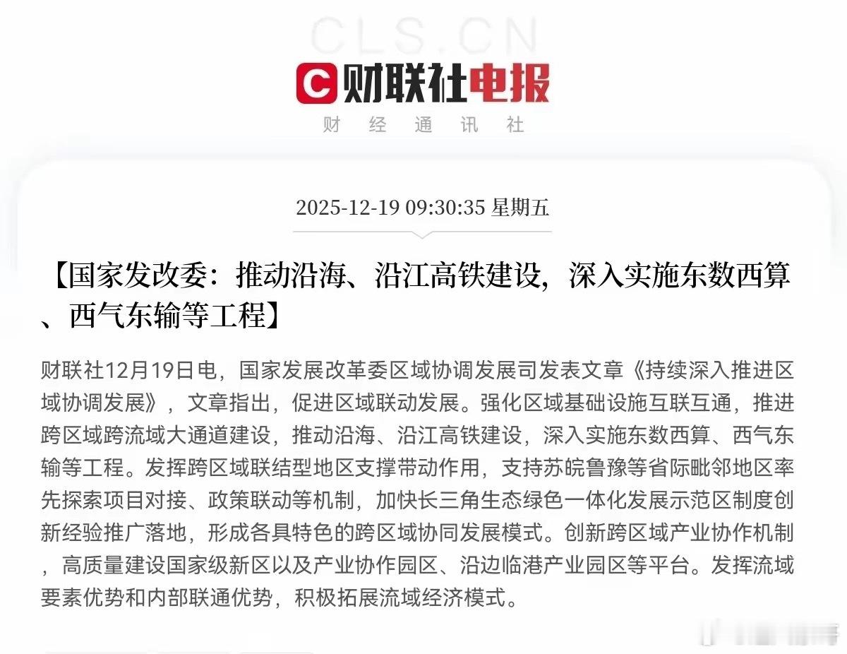 利好来了!利好来了!国家发改委重磅利好消息!机械设备、基建投资、高铁轨交迎来政策利好!预计今日基建、高铁轨交、机械设备概念有望大爆发了,持有这个方向的,今天估计有惊喜了…上午9点31分,国家发改委发布消息称,将推动沿海,沿江高铁建设,深入实施东数西算,西气东输等工程,这个消息对于基建工程、高铁轨交又是一大实实在在的利好,沿海、沿江高铁是我国八纵八横高铁主通道的重要组成部分,其加速推进意味着新一轮高铁线路规划、勘察设计、施工建设将进入高峰期,直接为轨道交通装备和工程建设带来巨额订单,总之国家发改委的政策将推动明确了中长期投资方向,为基建和高铁轨交板块提供了清晰的政策催化剂和业绩可见度,有利于提振市场信心,吸引长期耐心资本关注,基建、高铁轨交产业链将会迎来黄金发展机遇,是重大利好政策!股民们!坐稳扶好!受此利好消息影响,预计今日基建、高铁轨交板块要起飞!核心产业链公司要火力全开了!
