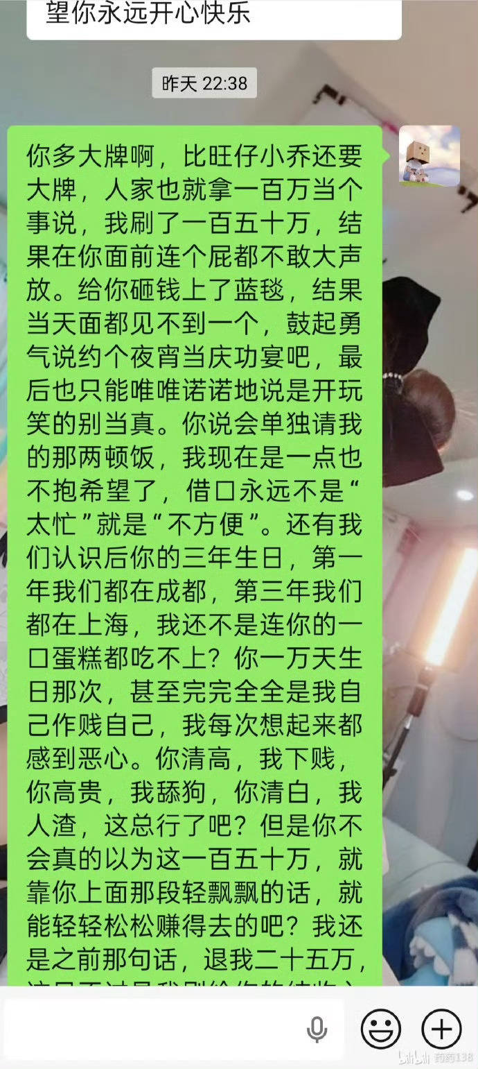 大哥刷了150万想约女网红吃饭还被鸽了? 女网友:“想要见面线下活动那么多,一定要单独见面才有情绪价值吗,我送他的黄金手链香水不是情绪价值吗,虽然比起来不算什么,但是他就可以用150w物化我带节奏wb我吗?”