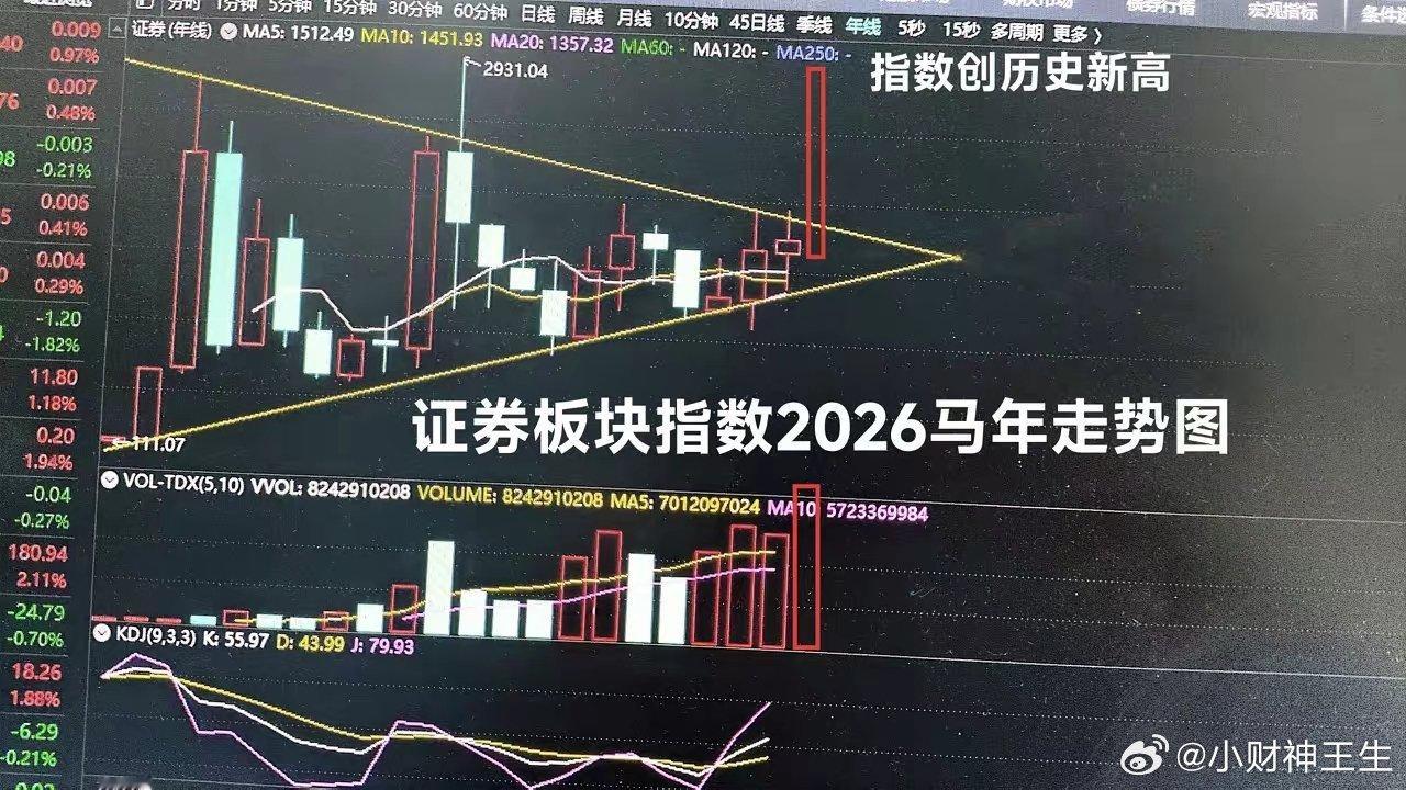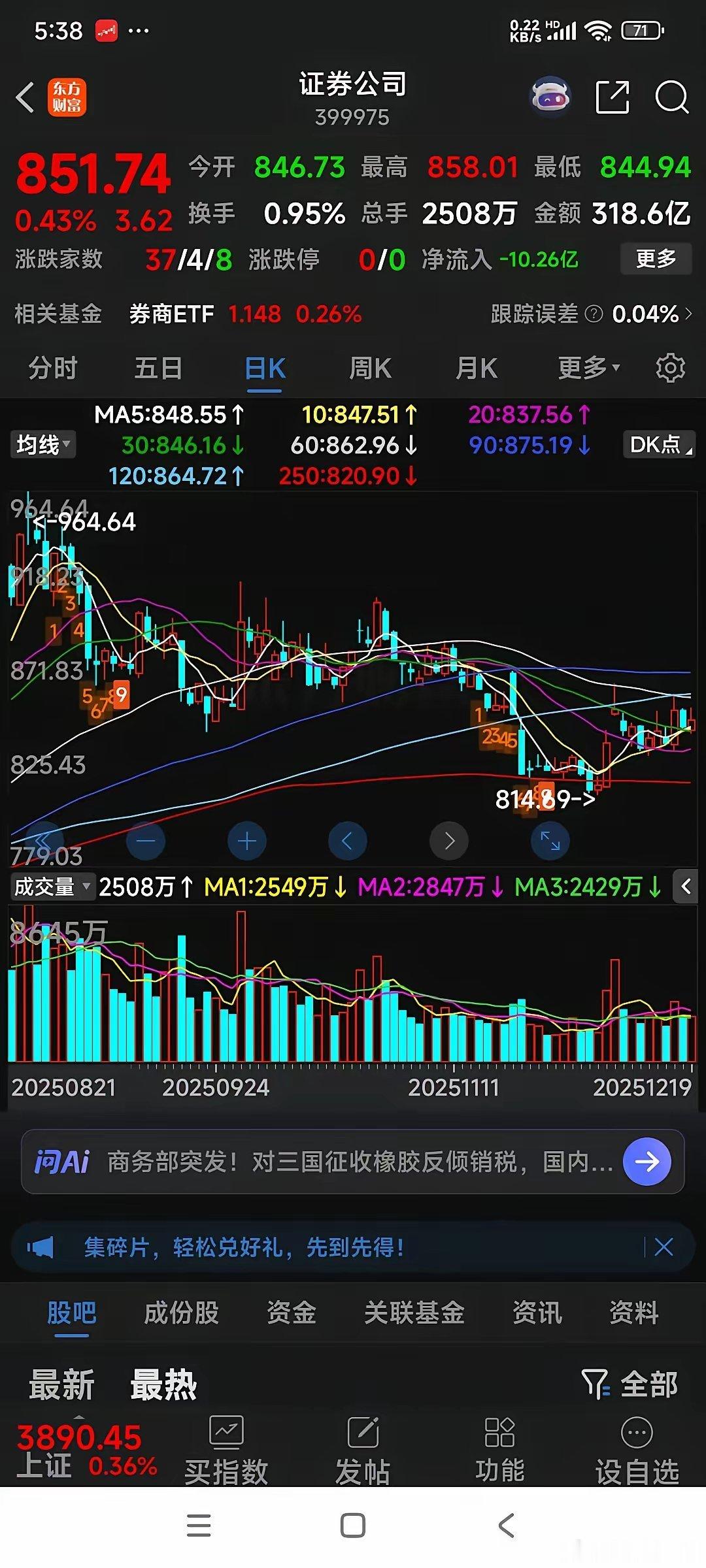 信已不信,行情都已反转,A股跨年行情将缓缓展开! 今日上证高开高走,开盘3878.23点,最高3902.23点,收盘3890.45涨0.36%,两市成交额1.75万亿,较昨天放大700亿,这是个积极信号。 25年仅余最后8个交易日,从下周开始,大A跨年行情将缓缓启动。 这是为什么呢?这是因为,券商板块已于12月4日先于大盘止跌,目前正在构筑一个新的上升平台,券商筑底,大盘再难下去(见图三)。 而上证指数昨天跌破11月24日的低点3816点见3815.84点后,已有构筑双底之迹象,日线KDJ金叉,MACD亦有零轴上再度金叉之意。 展望明年,本人认为,26年是十五五开局之年,也是中国经济复苏回升之年!中央财办、央行、财政部,证监会对明年的工作已作好充分动员与部署! 因此,明年马年,也许就是中国股市的大年,中国股市的丰年!上证指数或将以4000点为起点,向5000点进军!券商板块指数也或将创历史新高!