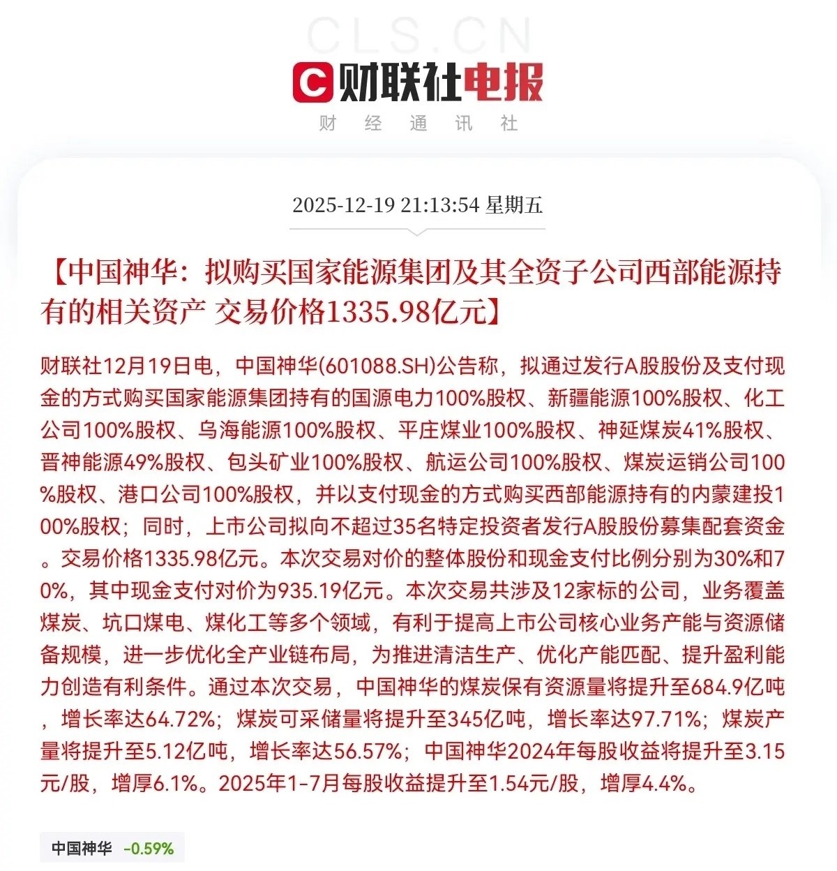 重大利好!周一中国神华要起飞了!晚间9点13分,中国神华突发重磅消息,拟购买国家能源集团及其全资子公司西部能源持有的相关资产,交易价格1335.98亿,并且向国家能源集团财务有限公司增资60亿,这是一个超级大利好消息,这笔交易如果完成将对中国神华的长期发展战略意义重大,不仅有利于巩固其行业地位,提升产业链协同,而且购买的都是煤炭,电力,铁路等优质资产,还有利于提升公司的整体盈利能力和抗风险能力,三季度最新数据显示,公司货币资金1244亿,未分配利润达2756亿,最新股息率达7.98%,这是妥妥的高股息加现金奶牛,这样的优质公司,谁不爱呢?不出意外的话,将会吸引更多的长期资本青睐!股民们!坐稳扶好!受此利好消息影响,预计下周一中国神华要高开高走,收中大阳线了,满仓持有的股民们!下周准备吃大肉吧!