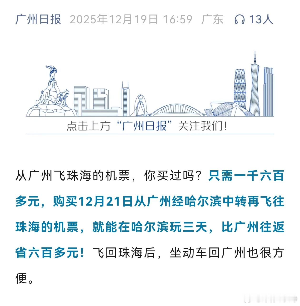 有网友晒出购买“回旋镖”机票低成本游玩一座城的攻略。广州飞珠海,中途在哈尔滨玩3