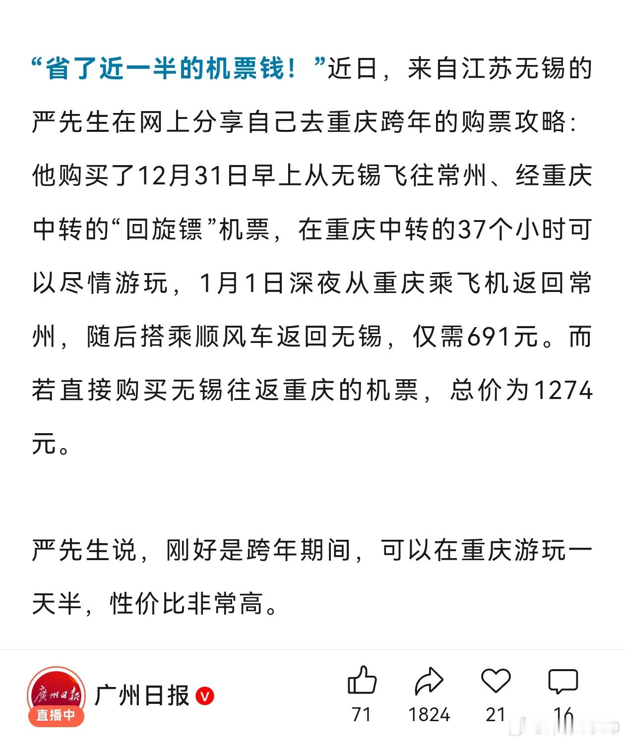 有网友晒出购买“回旋镖”机票低成本游玩一座城的攻略。广州飞珠海,中途在哈尔滨玩3天,能便宜600多元