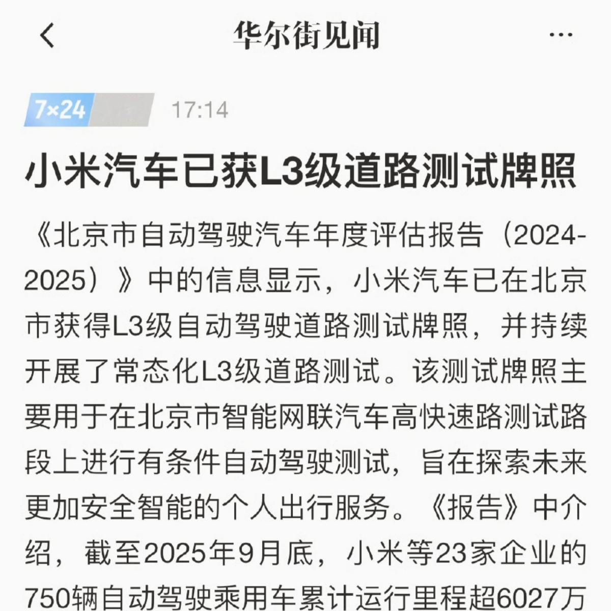 小米获得L3级测试牌照 长安获得L3级测试牌照 北汽获得L3级测试牌照 小鹏获得L3级测试牌照 理想获得L3级测试牌照 比亚迪获得L3级测试牌照 鸿蒙智行开启有条件L3级自动驾驶内测... 怎么说呢,L3在新能源车企中,完全是避不开的,说句难听的,未来谁落后谁淘汰,所以拿不拿得到这个许可,看的是技术实力。 其实头部车企基本上都拿到了,但小米汽车拿到,整个市场还是炸锅了,因为在AI和辅助驾驶这一块,王炸不是特别多,但yu7的辅助驾驶主动安全,大开眼界,还有大模型MIMO V2 Flash一出来,震惊了我的三观,科技感爆棚。所以再和L3联系起来,完全可以相信雷军的ai和智能化布局。 不过真正要说逆天的还是鸿蒙智行,因为L3测试是自家员工自购的问界和尊界车型。个人理解来看,就是跟大家买到的是一模一样的商品车,还不是那种非量产车上路测试,说的直白点,就是非常高的含金量。当然只要是国产汽车在进步,都值得点赞和支持。