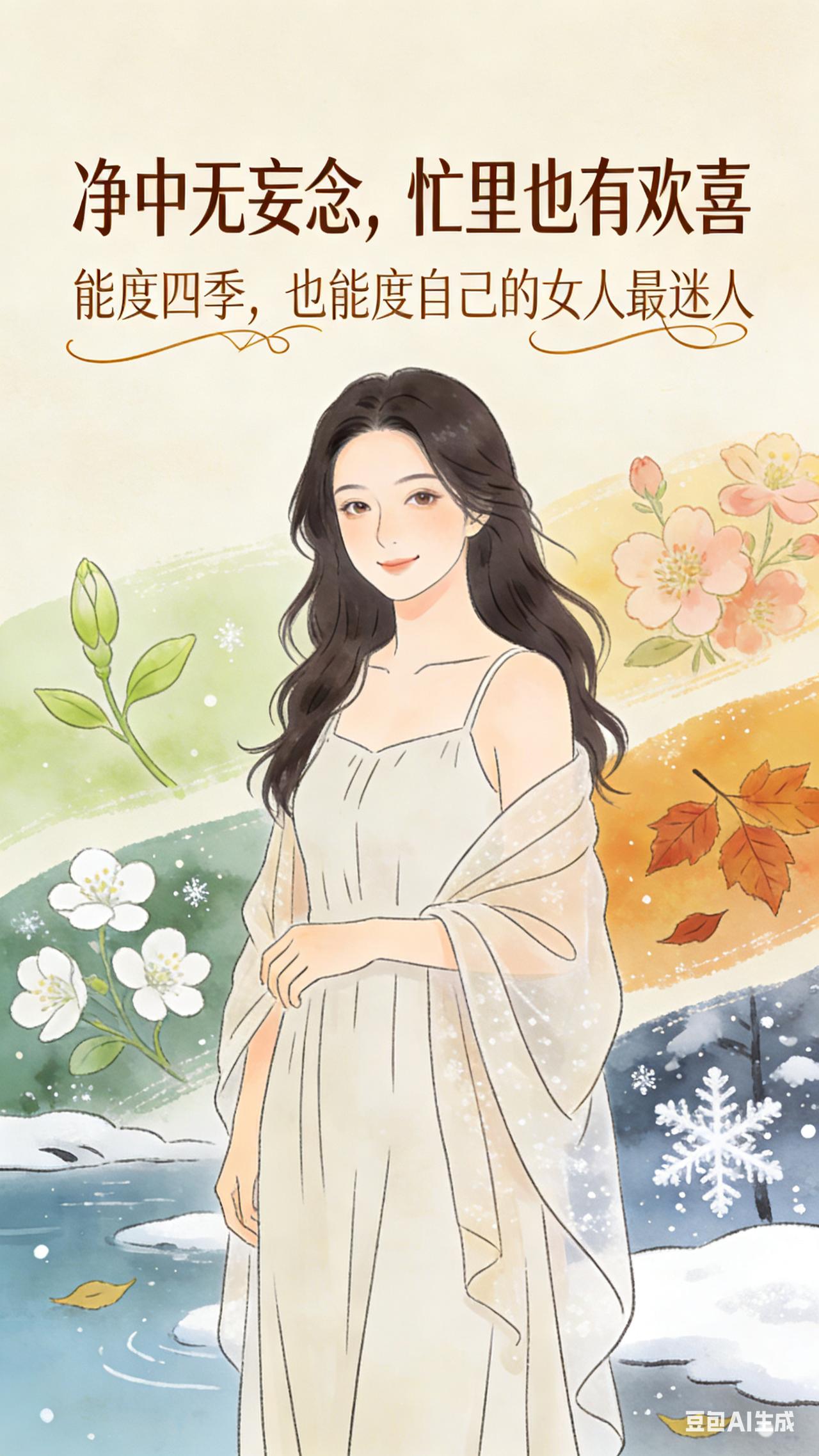 净心自渡,人间欢喜 净中无妄念,忙里也有欢喜。 这大抵是一个女人最好的状态。不必追着时光跑,也不必困在他人的期待里。晨起煮一壶清茶,看水汽氤氲,心就跟着静下来;案头的花谢了又开,日子平淡,却处处藏着细碎的暖。 没有妄念缠身,便少了许多内耗。遇到烦心事,不钻牛角尖,也不怨天尤人,只是默默收拾好心情,继续往前走。该忙的时候认真忙,为一顿饭、一件衣、一份喜欢的小事奔波,汗水落下来,也带着踏实的甜;闲下来的时候,就和自己对话,读几页书,写几行字,或是坐在窗前发会儿呆,与清风明月相伴。 一个能度四季的女人,定然也能度自己。春看百花秋赏月,夏听蝉鸣冬踏雪,四季的更迭是风景,也是生命的修行。她懂得在春天播种希望,在冬天积蓄力量,不慌不忙,不卑不亢。她不与岁月较劲,只与自己和解,把生活过成一首温柔的诗。 这样的女人,最是迷人。她的眼里有光,心里有海,净守本心,忙中拾趣,在烟火人间里,活成了自己的太阳。灵魂清净 净心心静 净心福慧 人间若若清心度 净心悟境