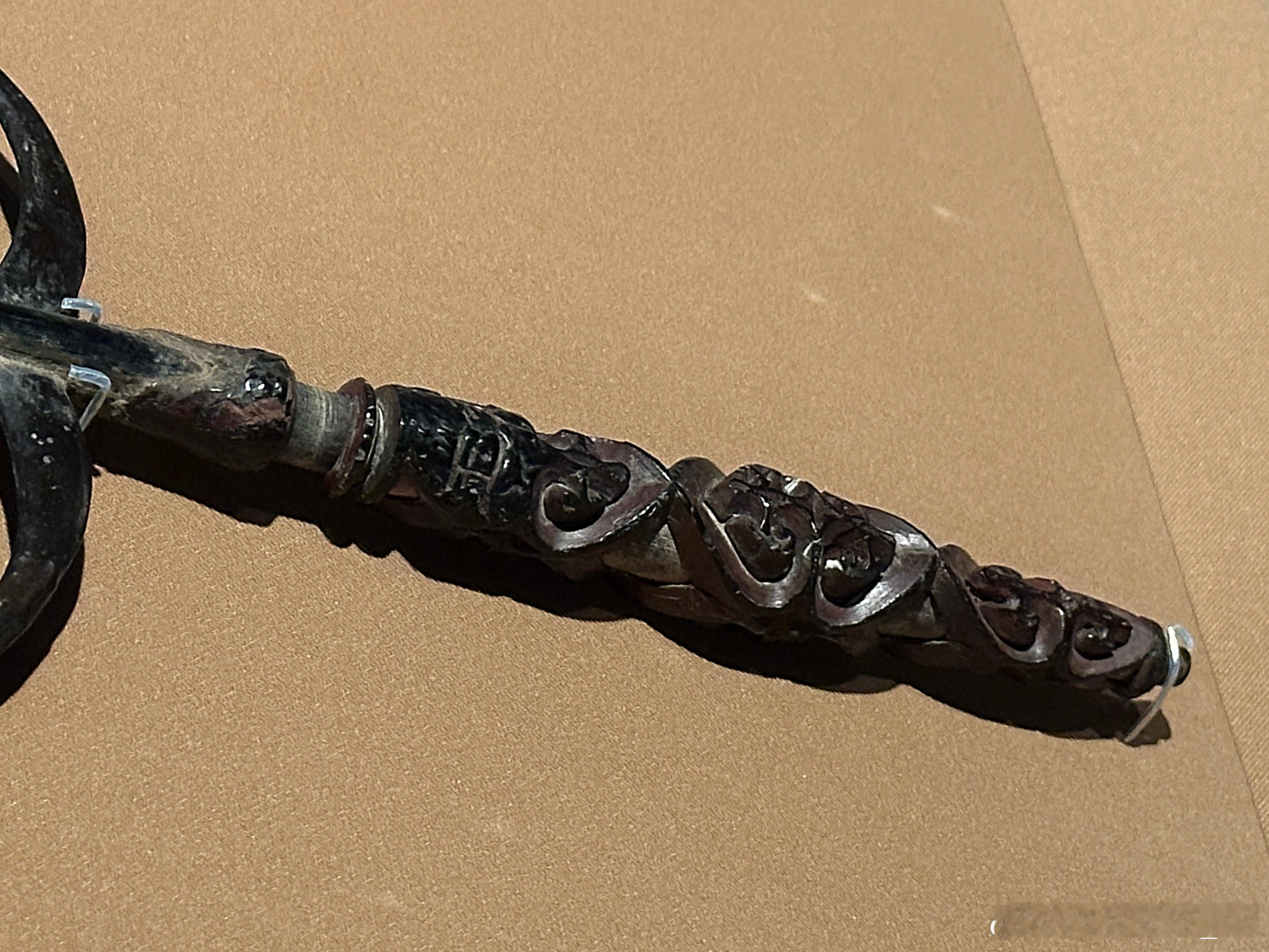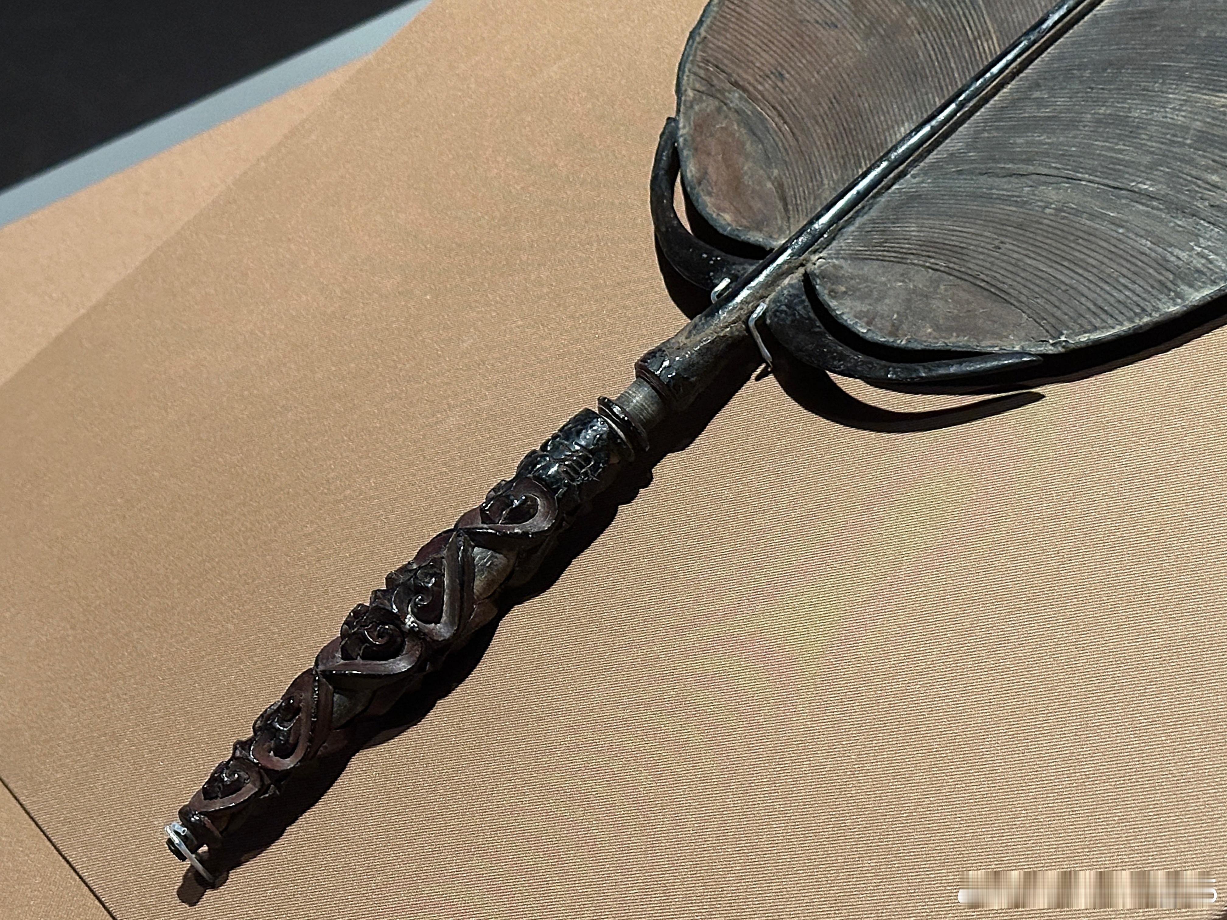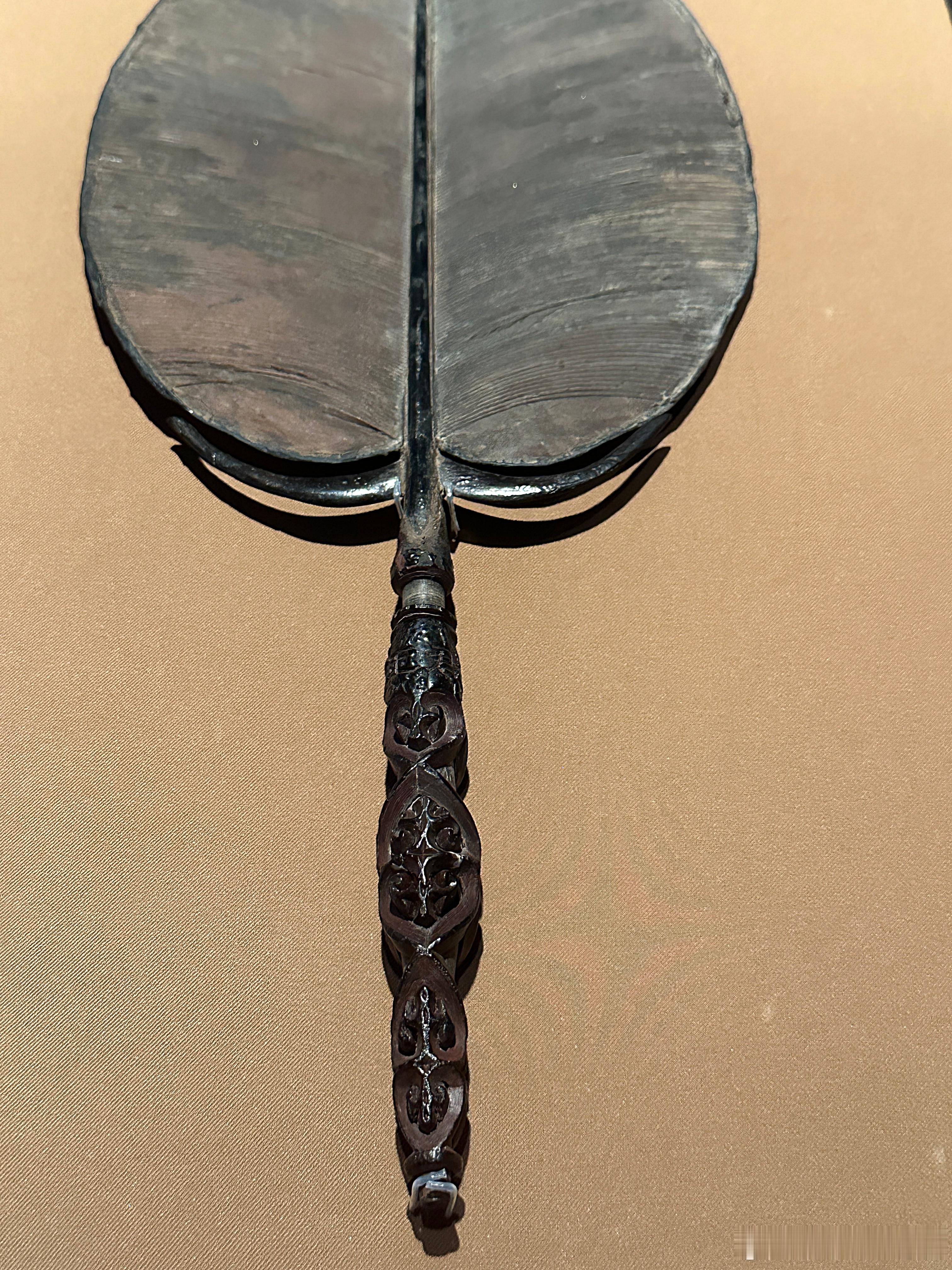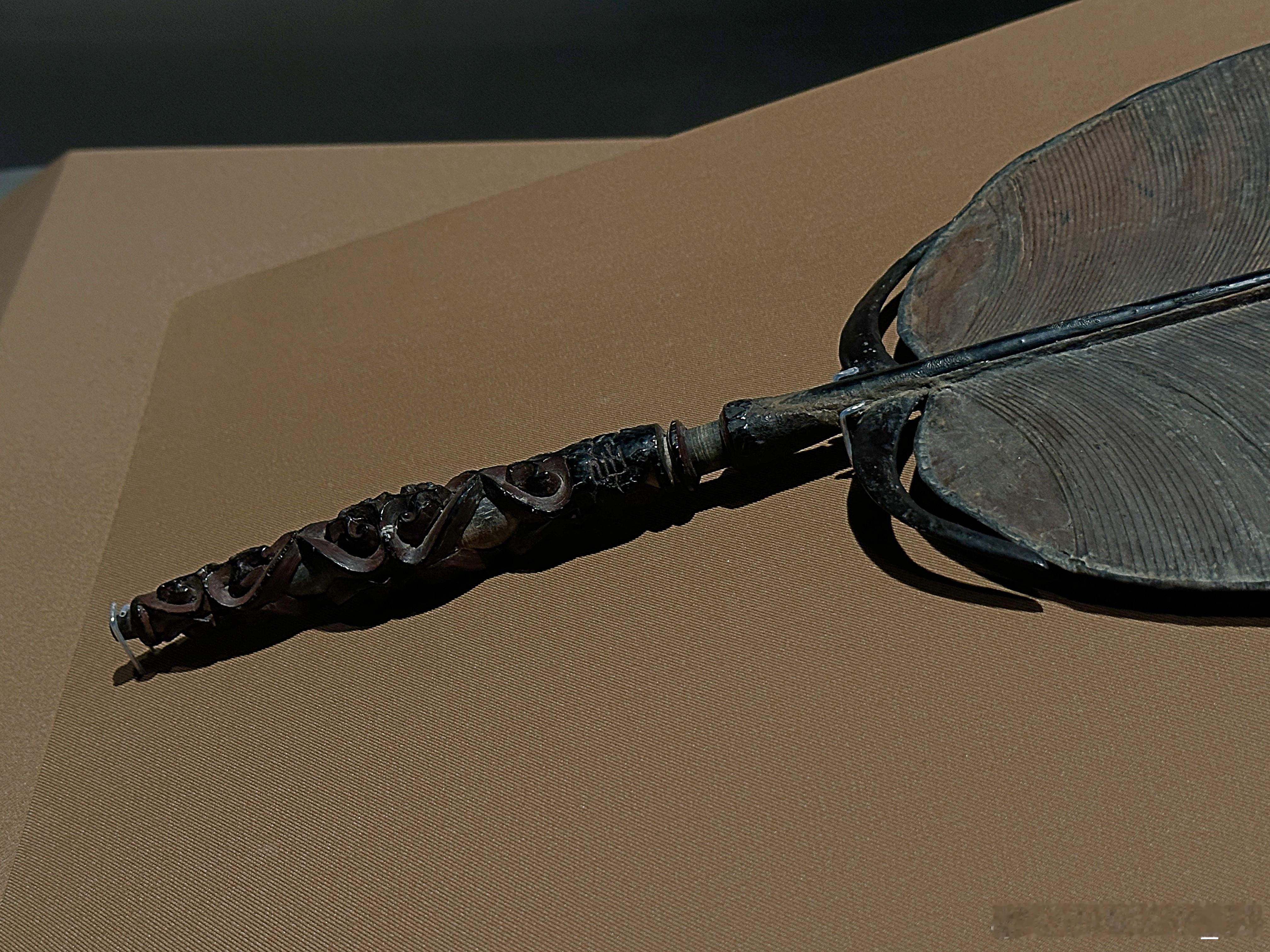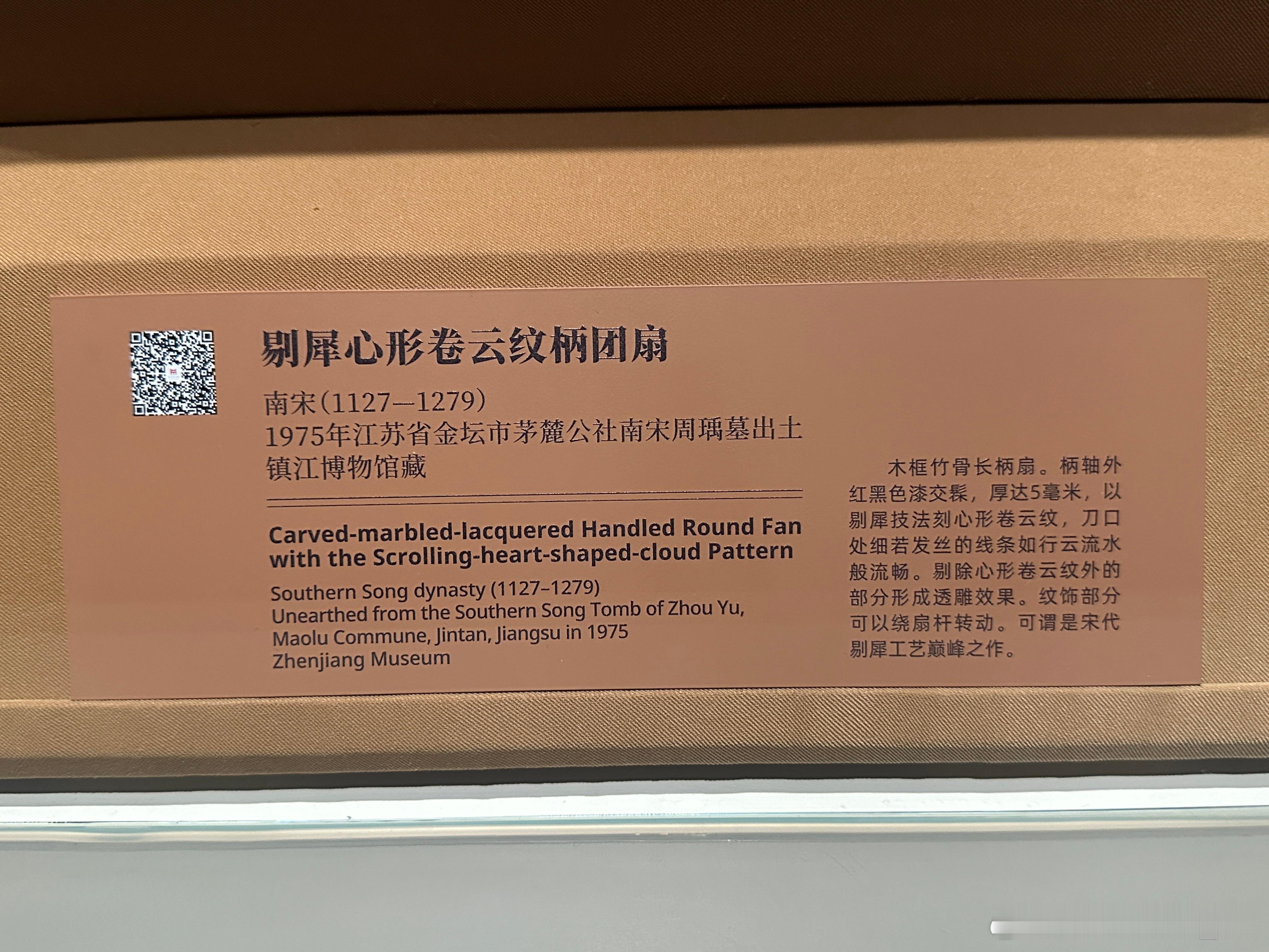剔犀心形卷云纹柄团扇南宋(1127—1279)镇江博物馆藏1975年江苏省金坛市茅麓公社南宋周瑀墓出土。木框竹骨,椭圆形扇面,长柄扇。扇面以竹篾丝为骨,月牙形托护持扇面,扇面素面,裱纸施杮汁。扇柄细木杆为轴,中间略粗两端稍细,形似橄榄。扇柄采用脱胎和剔犀两种工艺制成:柄轴外红黑色漆交髹,厚达5毫米,以剔犀技法刻心形卷云纹,刀口处可见细若发丝的线条如行云流水般流畅。心形卷云纹以外的部分被剔除,形成透雕效果。“君玉”二字刻在扇柄头部,可能是墓主周瑀的字号。此扇造型优美,工艺精湛,保存完好。特别是剔犀心形卷云纹部分可以绕扇杆自由转动。可谓是宋代剔犀工艺巅峰之作。红翠斗芳菲:宋元明漆器珍品展 摄于上海博物馆