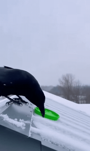 脑袋小,不一定不聪明。 过去是乌鸦喝水,随着时间的推移,现在乌鸦也升级了,开始借着盆子滑雪了, 而且它还知道身体向下滑,身体往后倾。 明明它是会飞的鸟,可它便要滑雪。你说,这是不是人们常说的“吃饱撑着了,闲的没事干。” 唉!鸟也不能吃的太饱……