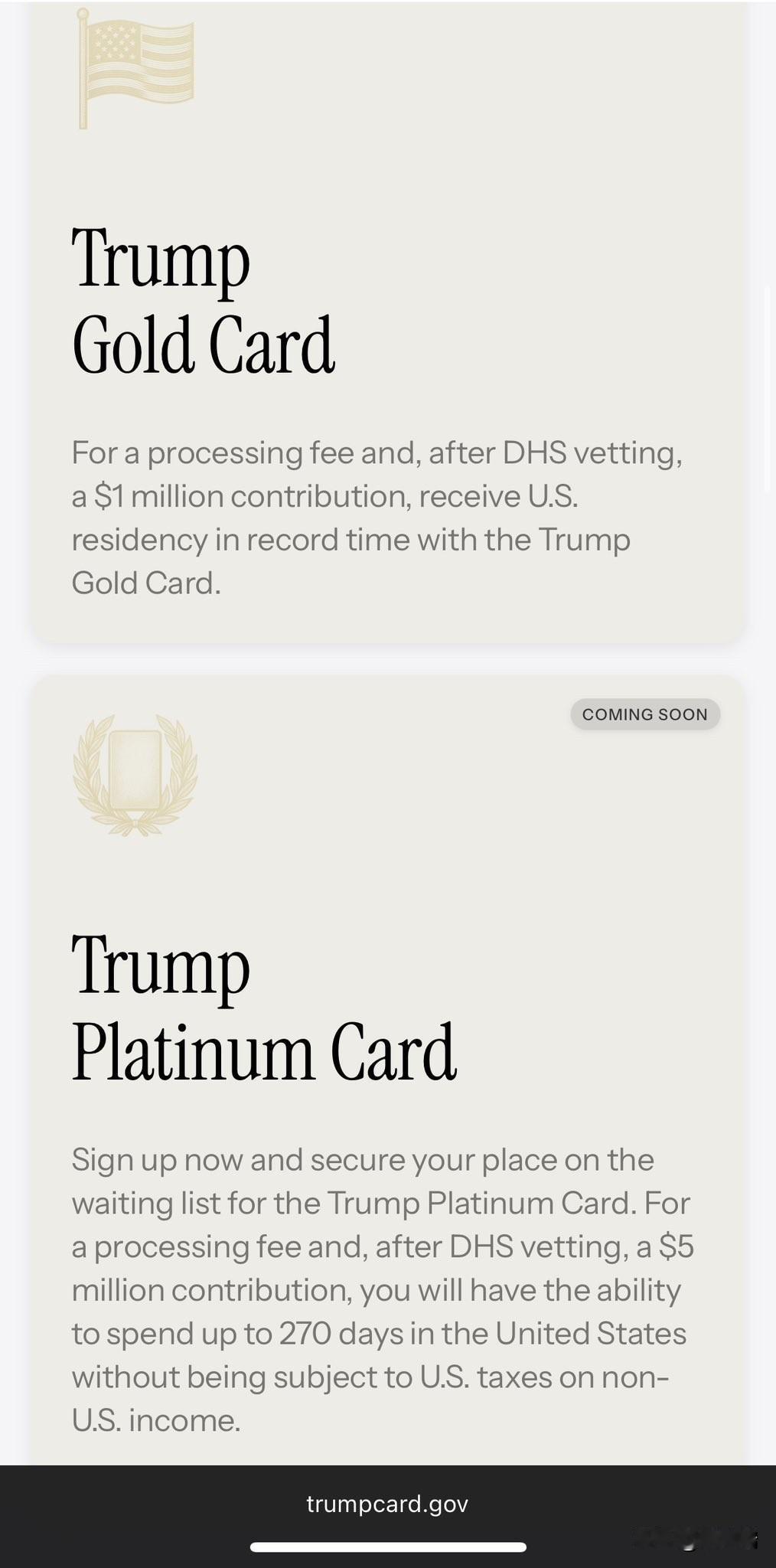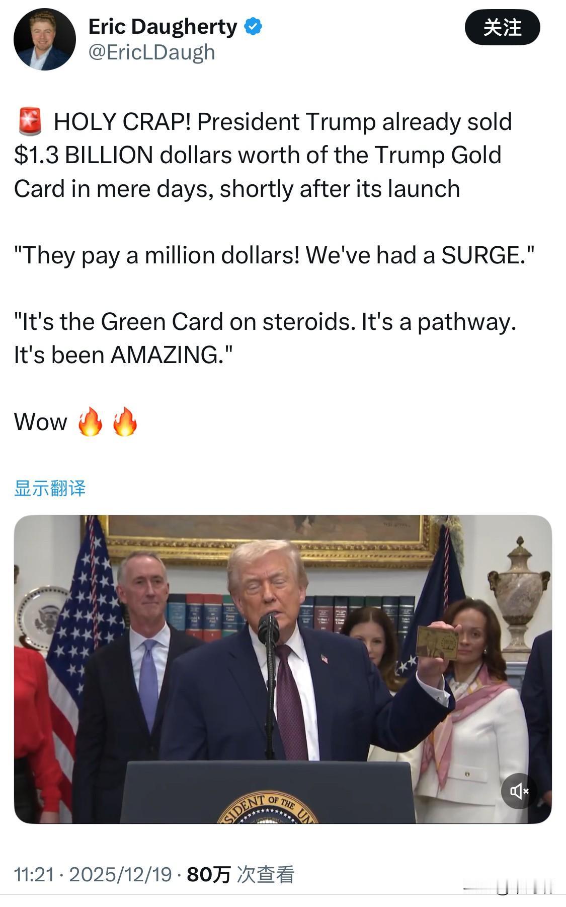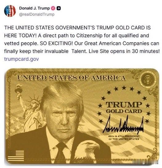 特朗普总统推出特朗普金卡后短短几天内,就售出了价值13亿美元的金卡。 该计划允许富有的外国人支付 100 万美元(公司为员工支付 200 万美元),以快速获得美国合法永久居留身份(绿卡)。此外,申请人还需支付不可退还的 15,000 美元处理费。 用途: 特朗普表示,这笔钱将全部用于减少美国国债。 该计划有效地为现有的 EB-1 和 EB-2 签证计划增加了一种新的收费模式。