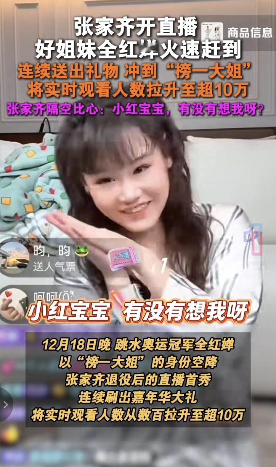 当年跳水“三小只”并肩作战的画面还在眼前,如今张家齐退役转型直播,全红婵依旧是那个重情重义的小姑娘,空降张家齐的直播间,狂刷礼物登顶榜一,将实时观看人数从数百拉升至十万,最后留言“姐姐加油”离开,14岁并肩竞技的情谊,从未因退役褪色,成年人的世界太多渐行渐远,可她们的友情却在时光里愈发珍贵,张家齐和全红婵这对跳水姐妹花的感情堪称“神仙友谊”。(图片来源于网络侵删)