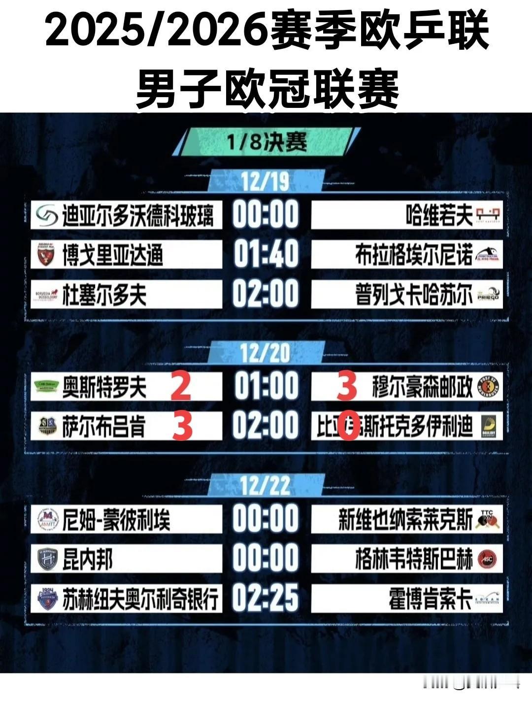 2025-2026赛季欧冠乒乓球联赛 1/8决赛:12.19 【萨尔布吕肯3-0比亚韦斯托克多伊利迪】 1.樊振东3比0霍多尔斯基(1,5,5) 2.达科·约奇克3比0霍伊诺夫斯基(3,5,4) 3.帕特里克·弗朗西斯卡3比0曾根翔(9,8,7) 恭喜萨尔布吕肯,晋级欧冠8强!