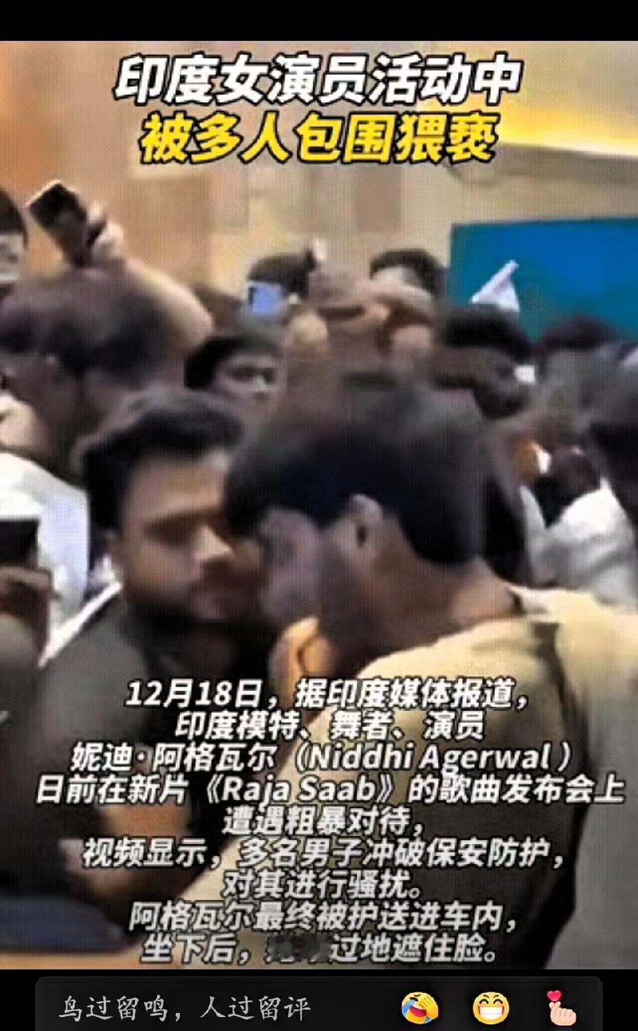 我看谁还敢说能放心去印度玩的,一个印度女明星,宣传新片时被男粉丝围攻,要不是有保镖,不知道还能不能走出这个商场。 明明是在海得拉巴的购物中心做新片宣传,这地方是印度排名前五的大城市首府,按理说有基本的安保保障,可散场后的一幕还是让人揪心。 原本只是粉丝上前想要握手互动,没走几步就演变成了围堵,人群里三层外三层把妮迪困在中间,拥挤推搡间,还出现了一些越界的肢体接触。 要不是随行保镖拼尽全力护着她往外冲,在人群里撕开一条路,后果确实难以预料。回到车上的妮迪捂着脸,肩膀止不住地发抖,看着特别委屈,这哪里是什么追星现场,分明就是一场让人心有余悸的意外。 那些天天在网上吹嘘印度治安好的博主,真该好好看看这个视频!别总拿富豪专属的私人区域、有专人保驾护航的路线说事,普通人去印度旅行,根本没有那么多特权和防护。 连自带安保的女明星都难逃这样的骚扰,更别说独自出行的普通女生了,真遇到类似情况,大概率没有招架之力。 旅行的意义从来都是看风景、放松心情,而不是拿自己的人身安全去赌运气。更别拿“你没遇到不代表没有”来抬杠,安全隐患这种事,只要存在,就不能心存侥幸。 那些鼓吹“普通人可以放心去印度”的言论,真的该消停了。分享旅行见闻没问题,但绝不能抛开安全底线去误导别人。毕竟对每个人来说,安全永远是出行的第一位,没有任何东西能比得过。