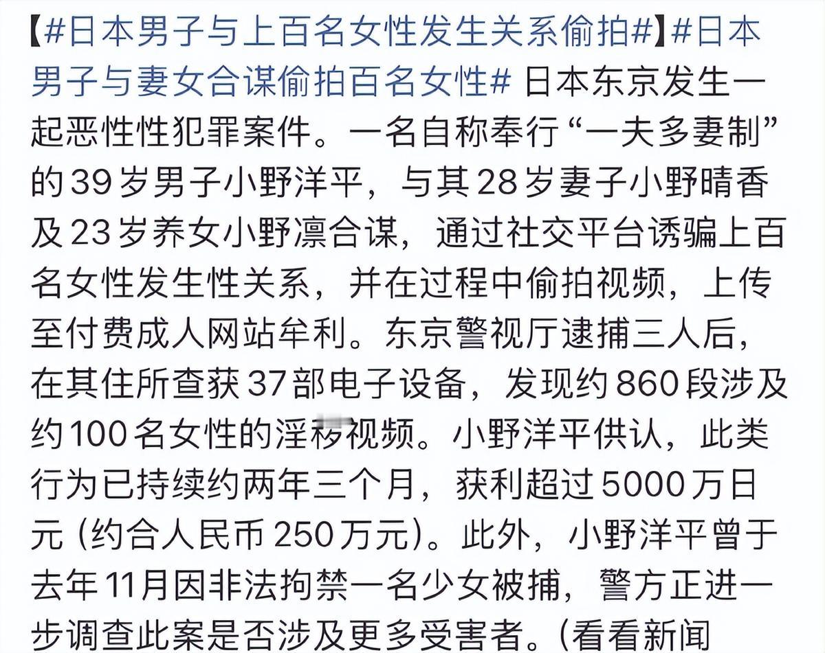 日本东京发生一起恶性性犯罪案件。一名自称奉行“一夫多妻制”的39岁男子小野洋平,与其28岁妻子小野晴香及23岁养女小野凛合谋,通过社交平台诱骗上百名女性发生性关系,并在过程中偷拍视频,上传至付费成人网站牟利。 “荒唐的国度荒唐的思想,做出这样荒唐的行为倒也见怪不怪。” 三个本该彼此守护的家人,却借着一套荒诞的扭曲逻辑,联手编织了一张针对上百名女性的陷阱网,把侵害他人当成了理所当然的事。 案件的曝光,也让外界再次窥见日本社会里那些脱离常轨的疯狂思想,是如何催生出泯灭人性的犯罪。 案件的曝光源于一名十多岁少女的勇敢逃脱。 期间,小野洋平不仅没收了她的手机,还拿出手铐、项圈和电击枪进行威胁,一遍遍告诉她“要是敢逃跑就杀了你”,甚至用“你是一只动物”这样的话语进行精神控制。 直到某天找到空隙,少女拼命逃到大阪报警,这起隐藏在黑暗中的犯罪才初露端倪。 当警员闯入三人居住的住所时,小野洋平还试图从阳台跳楼逃跑,最终因尾椎受伤被当场制服。 更令人毛骨悚然的是,警方在他们常用的酒店客房里,发现了伪装成火灾报警器的隐蔽摄像头,这些摄像头藏在天花板的角落,不仔细观察根本无法察觉,而这正是三人实施偷拍的关键工具。 被捕后他直言不讳地供述,自己始终奉行所谓的“一夫多妻制”,甚至早就计划着未来要娶四个妻子,还曾堂而皇之地向受害者透露自己的控制蓝图。 他还在私下里给妻子晴香和养女凛起了“企鹅”、“兔子”的专属昵称,自己是顶级大叔。 用这种幼稚又偏执的称谓,构建起一个封闭又变态的关系圈,疯狂思想强行灌输给身边最亲近的人,让她们成为自己犯罪的帮凶。 警方目前正在全力追查偷拍视频的流向,同时进一步排查是否存在更多潜在受害者,案件预计将于明年正式开庭审理,日本检方已经明确表示会寻求重刑处罚。 这起案件之所以让人脊背发凉,根源就在于它不是单一的恶性犯罪,而是一套疯狂思想主导下的集体作恶。 小野洋平的疯狂,不在于一时冲动的恶行,而在于他把侵害女性、控制他人当成了“合理”的追求,还成功拉拢妻子和养女认同这套逻辑。 就像日本社会历史上那些被扭曲的集体意识一样,把作恶包装成彼此认可的内部规则,从而彻底泯灭了道德底线。 在数字时代的加持下,这种疯狂思想驱动的犯罪更具隐蔽性和危害性,他们利用社交平台的匿名性寻找目标,用情感和利益作为诱饵,让受害者在毫无防备的情况下落入陷阱。 有网友感慨“原来痴汉文化背后还有这样有组织的犯罪。” 日本社会根深蒂固的性别偏见与女性权利认知的缺失,在这样的土壤里,女性常被视为弱势目标,甚至沦为他人牟利的工具,这也是痴汉现象屡禁不止的重要原因。 类似偷拍、骚扰等行为多被归为滋扰行为,仅处以罚款,难以形成震慑,这也让小野洋平这样的惯犯有恃无恐,犯罪行为不断升级。 日本社会盛行耻感文化,受害者往往因羞耻感选择沉默,担心公开身份遭受二次伤害,仅让更多潜在受害者面临风险,也可能导致罪犯被轻判。 对于这件事,您有什么想说的吗?欢迎评论区留言讨论。 信息来源:看看新闻