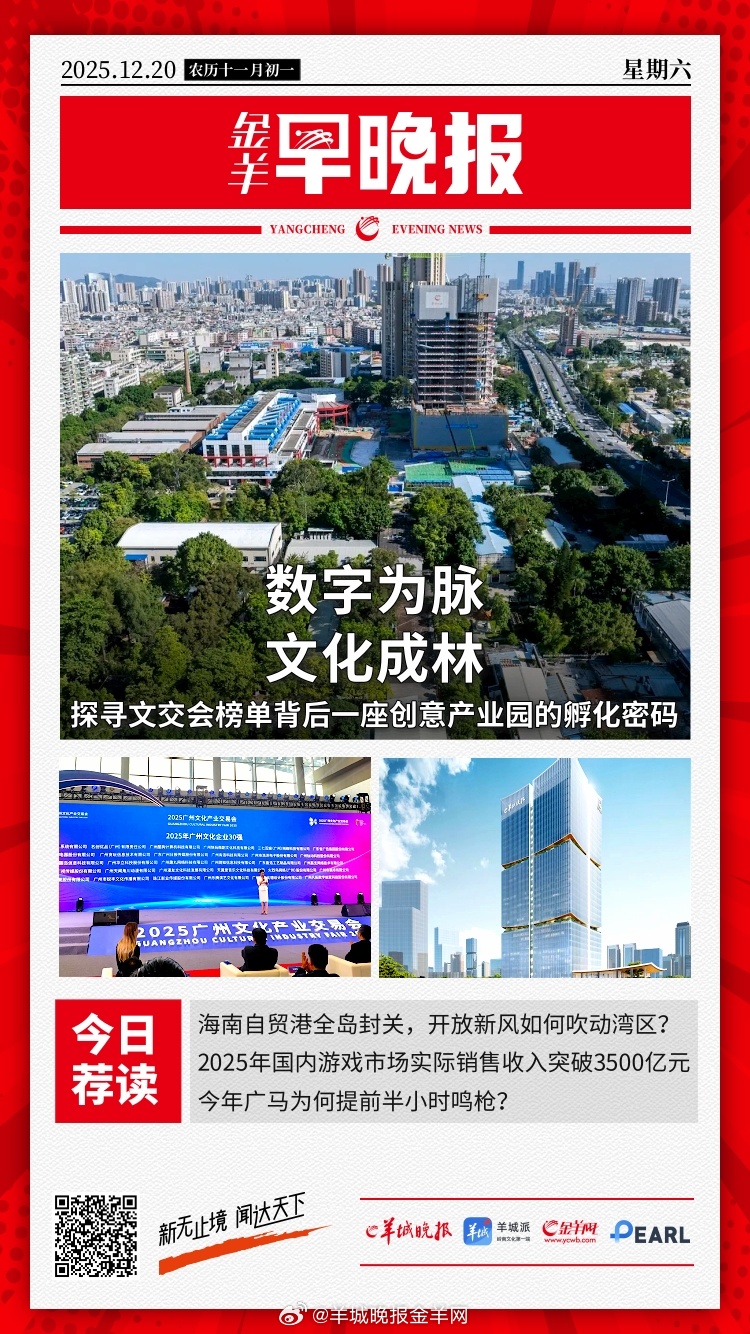 #金羊早晚报# 从“老厂房”到“产业雨林”:文交会榜单背后,一座创意产业园的孵化密码;2025广州文化企业30强新鲜出炉,10%的企业就在羊城创意产业园!突破3500亿元!2025年国内游戏市场实际销售收入再创新高;#海南封关40克金饰能省1万多元# 海南自贸港全岛封关,开放新风如何吹动湾区?2025“年度字词”揭晓;高速上刹车失灵!小轿车时速115狂奔490公里,司机4个半小时高度紧张,下车后浑身发抖无法说话;一大型牲畜交易市场粪水直排入江?广西南宁通报;天津一医院女护士被偷拍,最新通报:已抓获涉案男护士;《阿凡达3》上映,预售破亿,但先期评价为何两极分化?今年广马为何提前半小时鸣枪?赛事总管这样说;外交部:美方“以武助独”只会引火烧身,“以台制华”绝对不会得逞;商务部:对原产于美国、韩国和欧盟的进口三元乙丙橡胶继续征收反倾销税。#今天2026考研##考研初试##普京承认自己正在恋爱中# 更多精彩报道,请扫码关注羊晚全媒体报道!