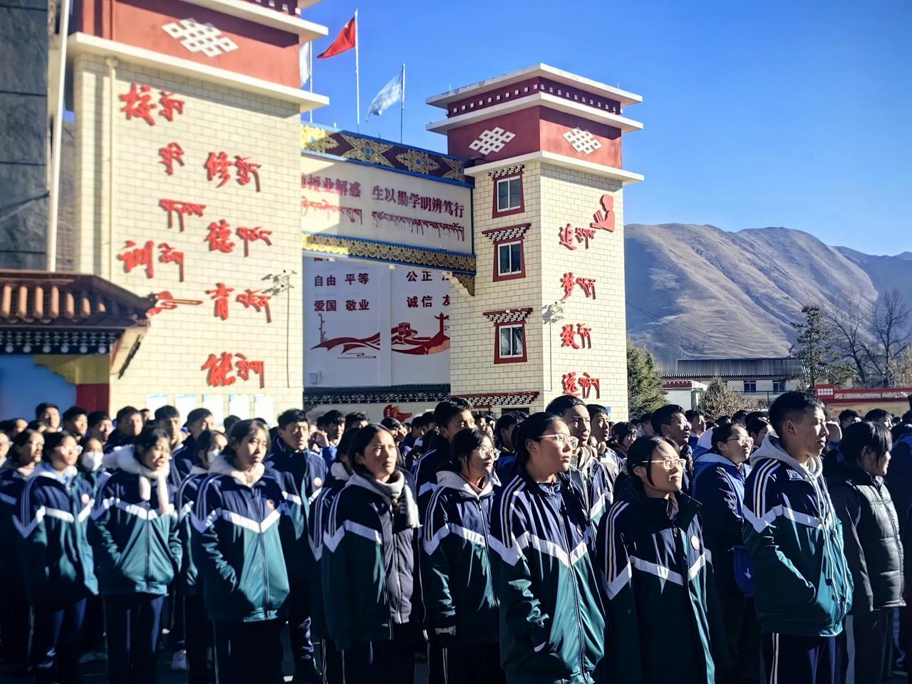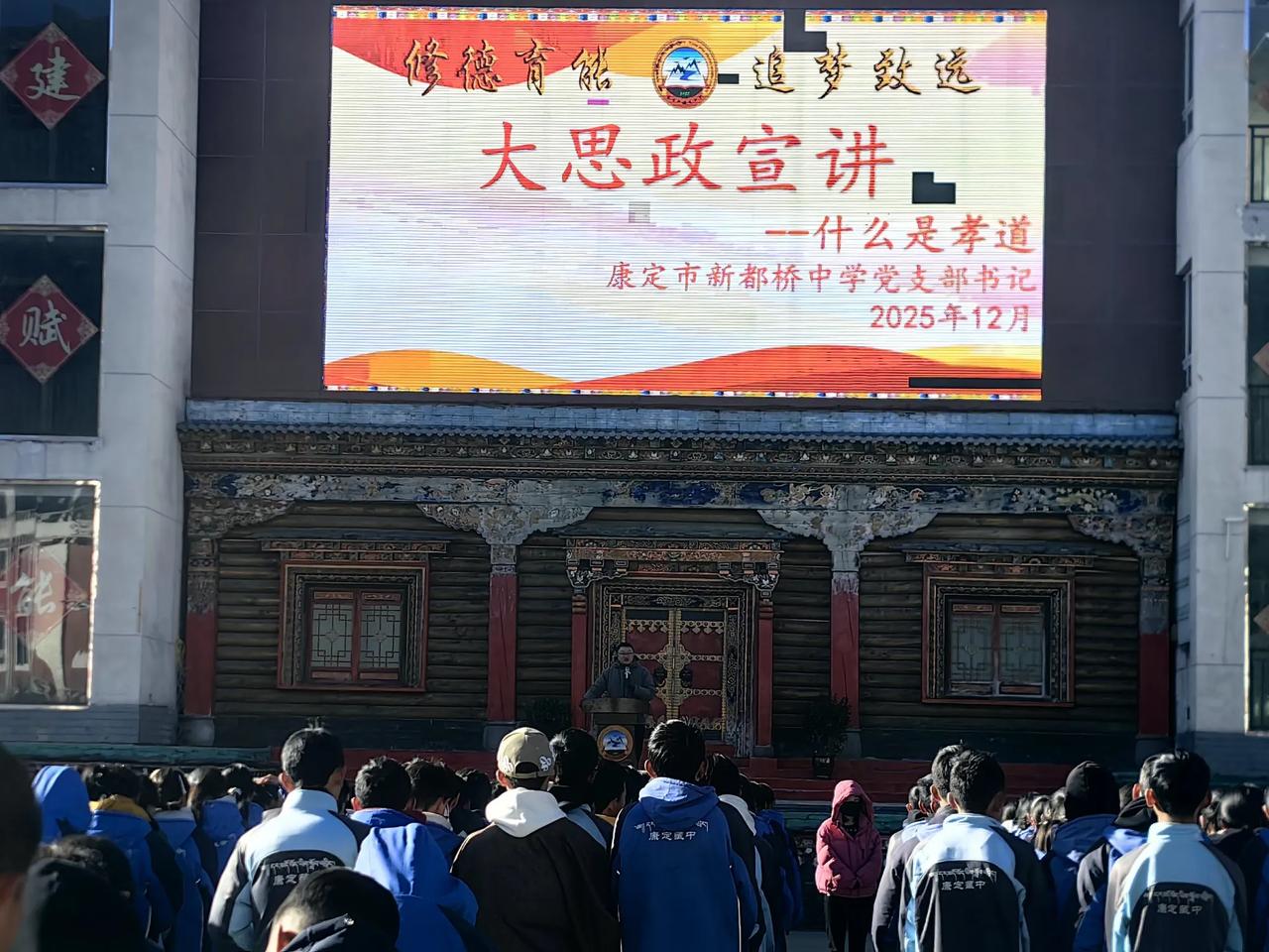 冬阳里的思政课,在雪域高原点亮成长灯塔 作为一名扎根新都桥的支教老师,我总被这片高原的阳光偏爱,尤其是冬日的暖阳,不似盛夏那般炽烈,却带着穿透寒风的温柔,把藏式校园的白墙红瓦晒得暖意融融。 12月19日这天,这样的阳光铺满了整个操场,近2000名师生整齐列队,一场特殊的“大思政课”就在这温暖的光影里拉开了序幕。 主讲人是学校的党支部书记、校长杨波。从踏上讲台的那一刻起,他的声音就带着高原教育者特有的赤诚,既有对学生的谆谆教诲,又有对成长的恳切期许。这堂长达80分钟的课程,没有空洞的理论说教,全是扎根生活的真实案例!从家里如何体谅父母辛劳、践行孝道,到校园里怎样争当学习标兵、与老师同学和谐相处;从外出时的交通安全、饮食安全细节,到日常生活中勤俭节约的优良作风养成,每一个话题都精准戳中了高原学子成长路上的关键节点。 站在学生队伍的后侧,我格外留意着身边孩子们的反应。那些来自周边牧区、眼神清澈的孩子,有的认真低头记录,有的微微点头沉思,当校长讲到“珍惜学习机会,用知识改变命运”时,我看到几个藏族姑娘悄悄攥紧了拳头。这让我想起初到新都桥中学(原康定市藏文中学)时的见闻!这里的孩子大多来自偏远村寨,带着对外面世界的好奇和对成长的渴望,而这样接地气的思政课,正像一束光,为他们的人生方向锚定坐标。 杨书记的讲课风格格外有感染力,时而语重心长叮嘱细节,时而雄浑豪迈畅谈梦想,当他阐释学校“修德育能,追梦致远”的校训时,我忽然读懂了这所雪域高原学校的教育初心。“修德”是根基,教会孩子们做人的本分;“育能”是路径,助力他们掌握安身立命的本领;而“追梦致远”,则是要让这些高原少年敢于走出大山,更懂得回馈家乡。作为支教老师,我深知教育不仅是知识的传递,更是心灵的滋养,这堂课恰恰做到了后者!它没有宏大的叙事,却在孩子们心中种下了“做更好的自己”的种子! 课后和学生交流,有个藏族男孩认真地说:“校长讲的孝道教我要多帮阿妈做家务,安全知识也很有用,以后我会更注意保护自己。”身边的同事也感慨,这样的思政课让教育回归本真,真正走进了学生心里。我望着远处连绵的雪山,忽然觉得无比动容:在这片平均海拔3460米的土地上,教育者们正用真诚与坚守,为孩子们搭建起成长的阶梯;而这样温暖有力的思政课,就是阶梯上最明亮的灯塔。 作为一名支教老师,我很庆幸能见证这样的教育时刻。它让我明白,无论身处繁华都市还是雪域高原,好的教育都能直抵心灵。愿这些高原少年能带着这堂课的收获,在“修德育能,追梦致远”的校训指引下,长成有品德、有本领、有担当的模样,让青春在雪域高原绽放别样光彩!