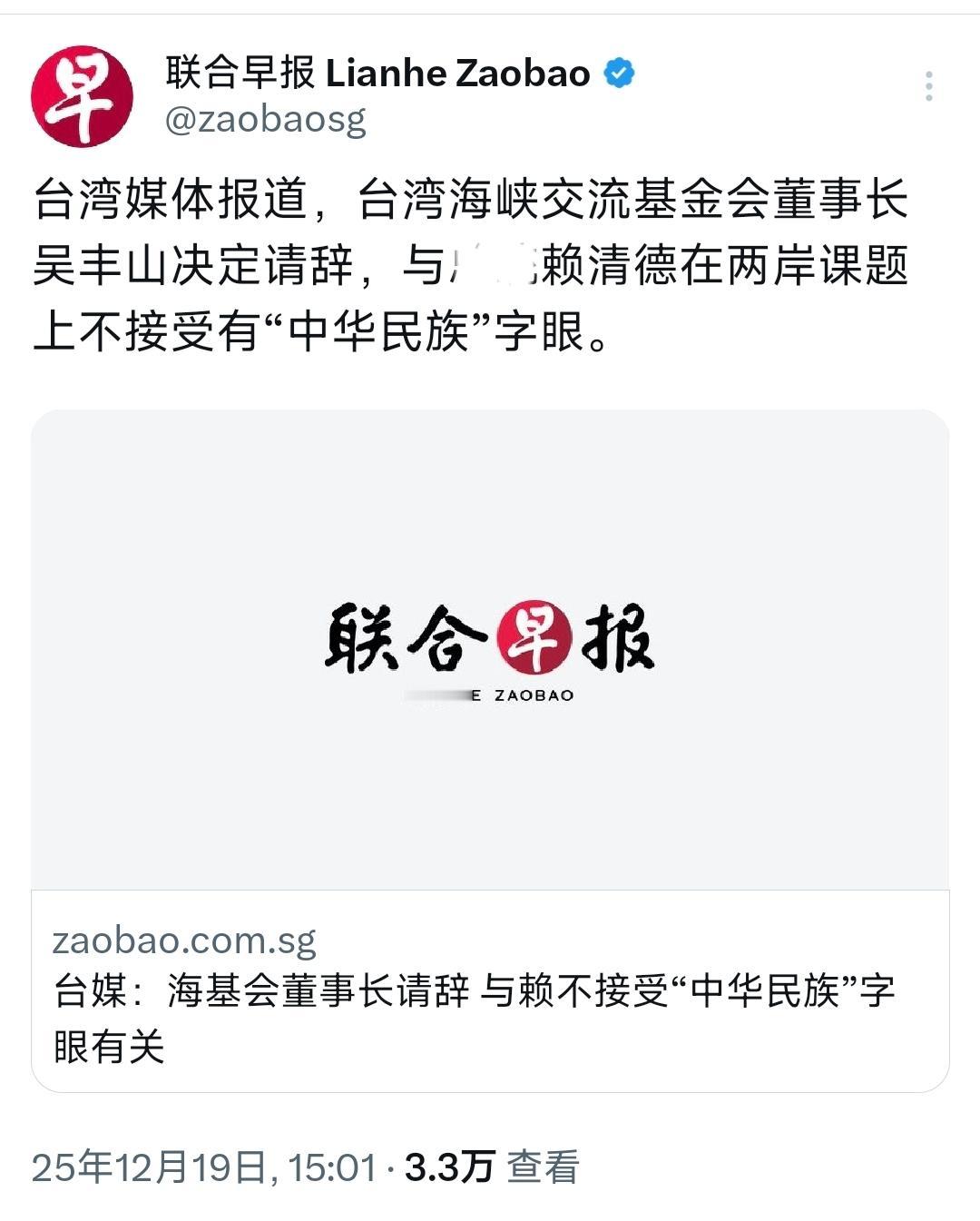 台湾海基会董事长吴丰山在董监事会议上宣布月底卸任,这场持续13个月的任职以辞职告终。这位76岁的资深政务官接任时,正值台海局势因赖清德当局拒不承认“九二共识”而陷入冰封,他试图以“中华民族,兄弟分立”为纽带重启两岸对话的努力,最终因触及赖清德的“台独”底线而夭折。 吴丰山的困境始于2024年11月的临危受命。彼时前任郑文灿因贪腐丑闻下台,海基会作为两岸唯一官方授权的民间交流平台,已因民进党当局的“抗中”政策沦为空壳。 他上任后提出的首项计划,是赴大陆探视台商并与海协会沟通,但所有提议均遭陆委会搁置——大陆方面明确回应,不承认“九二共识”则无对话可能。 更关键的冲突发生在今年9月,吴丰山在内部建议中写入“中华民族”表述,试图以此作为两岸关系的历史公约数,却被赖清德直接否决:“其他内容都可谈,唯独这个词不能出现。” 这种矛盾折射出赖清德当局的深层困境。自2024年5月上台以来,赖清德将“新两国论”系统化,在“双十”讲话中宣称“中华民国已在台澎金马落地生根”,刻意割裂两岸历史联结。 他主导的“17项策略”将大陆定义为“境外敌对势力”,收紧两岸交流政策,同时加速军购备战,延长兵役期至1年,甚至推动女性义务兵役。 这种“备战”与“对话”的矛盾路线,让吴丰山的务实尝试无处容身——陆委会一面要求他维系台商服务等“功能性交流”,一面禁止任何触及政治基础的对话。 岛内政治生态的变化加剧了这种撕裂。国民党副主席萧旭岑直言,吴丰山是“被辞职”,其温和路线与赖清德的“抗中”基调格格不入。 民众党立委张启楷则指出,海基会的停滞本质是两岸关系冻结的缩影:2016年以来,两会协商因“九二共识”争议中断,8年间换过5任董事长,无一能突破僵局。吴丰山任内曾试图绕过“九二共识”争议,提出“历史共信”等替代方案,但均被陆委会以“模糊一中原则”为由否决。 赖清德对“中华民族”的排斥,暴露了其“去中国化”的激进本质。据台媒披露,他在私下谈话中多次强调“台湾主体意识”,认为“中华民族”概念会削弱所谓“国家认同”。 这种意识形态的洁癖,让海基会连最基础的沟通功能都难以维系——吴丰山曾提议与大陆学者“不公开会面”讨论共识,却因陆委会担心“政治妥协”而流产。 当他在12月18日的会议上坦言“和睦是两岸最高贵的政治情操”时,台下的沉默已预示了结局:在民进党“抗中保台”的叙事下,理性对话者已无立足之地。 这场人事变动的深层,是台湾社会对两岸关系的认知分裂。海基会董事、台湾民众党中央委员林富男观察到,吴丰山的辞职并非个人失败,而是“在对立年代保留理性火种”的选择。 数据显示,2025年台湾民众对赖清德两岸政策的不满意度达40.5%,超7成民众担忧战争风险。 但民进党通过“绿色恐怖”打压异见,2024年以来已查处23起所谓“共谍案”,连陆配参政都遭限制,这种高压环境下,务实派的声音愈发微弱。 新任董事长人选苏嘉全的民进党背景,预示着海基会功能的进一步虚化。这位前“立法院长”素以配合当局路线著称,其上任后大概率延续“事务性处理+政治回避”的模式 。正如陆委会前主委夏立言所言:“海基会的作用取决于政策,而非人选。”当赖清德当局将“互不隶属”写入施政纲领,当“中华民族”成为禁忌词汇,任何人事调整都无法改变两岸交流的冰封状态——这不是海基会的困境,而是民进党“台独”路线的必然结局。 吴丰山离开时留下的,是台海局势的残酷现实:在“抗中”成为政治正确的台湾,任何试图跨越意识形态鸿沟的努力,都会被激进的“台独”叙事吞噬。 这位76岁老者的背影,映照出一个残酷的真理:当政治人物拒绝面对历史与现实,当意识形态凌驾于民生福祉,再美好的和平愿景,都终将沦为权力斗争的牺牲品。而这,正是台海最危险的时刻。