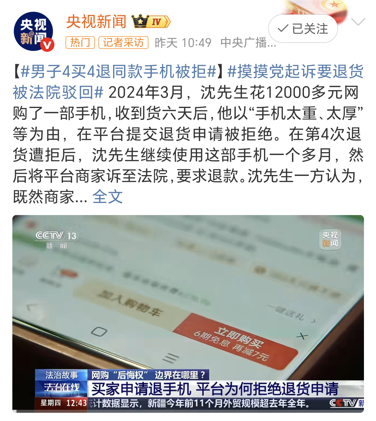 男子1年内买12部手机全部退货七天无理由退换货的初衷,是给消费者“试错权”。担心
