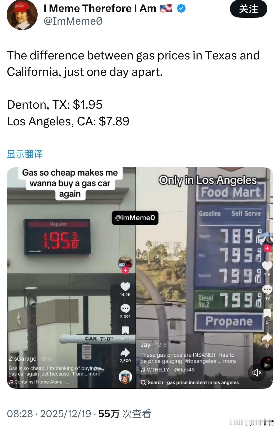 德克萨斯州和加利福尼亚州的汽油价格仅相隔一天,却相差甚远。 德克萨斯州丹顿:1.95美元 加利福尼亚州洛杉矶:7.89 美元 德克萨斯州和加利福尼亚州汽油价格的巨大差异是多种因素共同作用的结果,这些因素包括税收、法规、供应和地理位置。 主要原因: 高税收和费用: 加利福尼亚州的州和地方汽油税是全国最高的,远高于德克萨斯州。加州司机每加仑支付的税费和环境计划成本合计远超德州。 独特的燃油配方: 加利福尼亚州要求使用一种独特的、燃烧更清洁的汽油配方,以减少空气污染。生产这种特殊混合油的成本更高,而且只有少数炼油厂能够生产,限制了供应来源。 地理隔离和炼油能力: 加利福尼亚州的燃油市场相对孤立,没有管道连接到美国其他地区的炼油中心。大部分汽油是在州内提炼的,而且该州的炼油能力一直在下降。相比之下,德克萨斯州拥有大量炼油厂,靠近原油生产地,这降低了生产和运输成本。 环境法规成本: 加利福尼亚州实施了“总量控制与交易”(Cap-and-Trade)和低碳燃料标准(Low Carbon Fuel Standard)等环境计划,这些合规成本最终会转嫁给消费者。德克萨斯州则有更少的法规,使得在该州开展业务的成本更低。 简而言之,德克萨斯州因靠近供应源、法规较少和税收较低而享有较低的油价,而加利福尼亚州则因高税收、严格的环境要求和孤立的市场而导致成本高昂。
