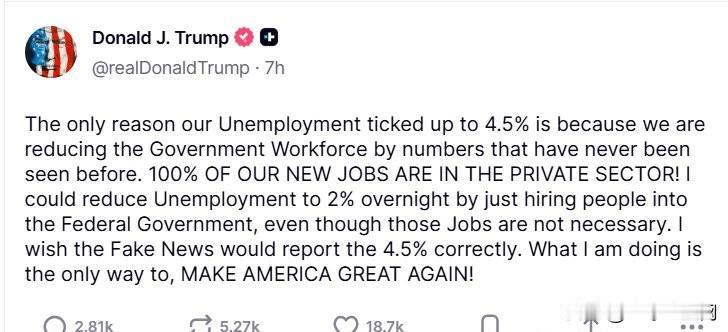 【黄金时代】川普解读,失业率上升是好事儿,因为都是政府员工失业,而新增岗位都在私营部门! 川普: 我们的失业率之所以上升到4.5%,唯一的原因就是我们正在以前所未有的规模裁减政府员工。我们新增的就业岗位100%都在私营部门!即使联邦政府并非必需,我也可以通过增加联邦政府的招聘,一夜之间将失业率降至2%。我真希望那些假新闻媒体能如实报道4.5%的失业率。我所做的,是让美国再次伟大的唯一途径!