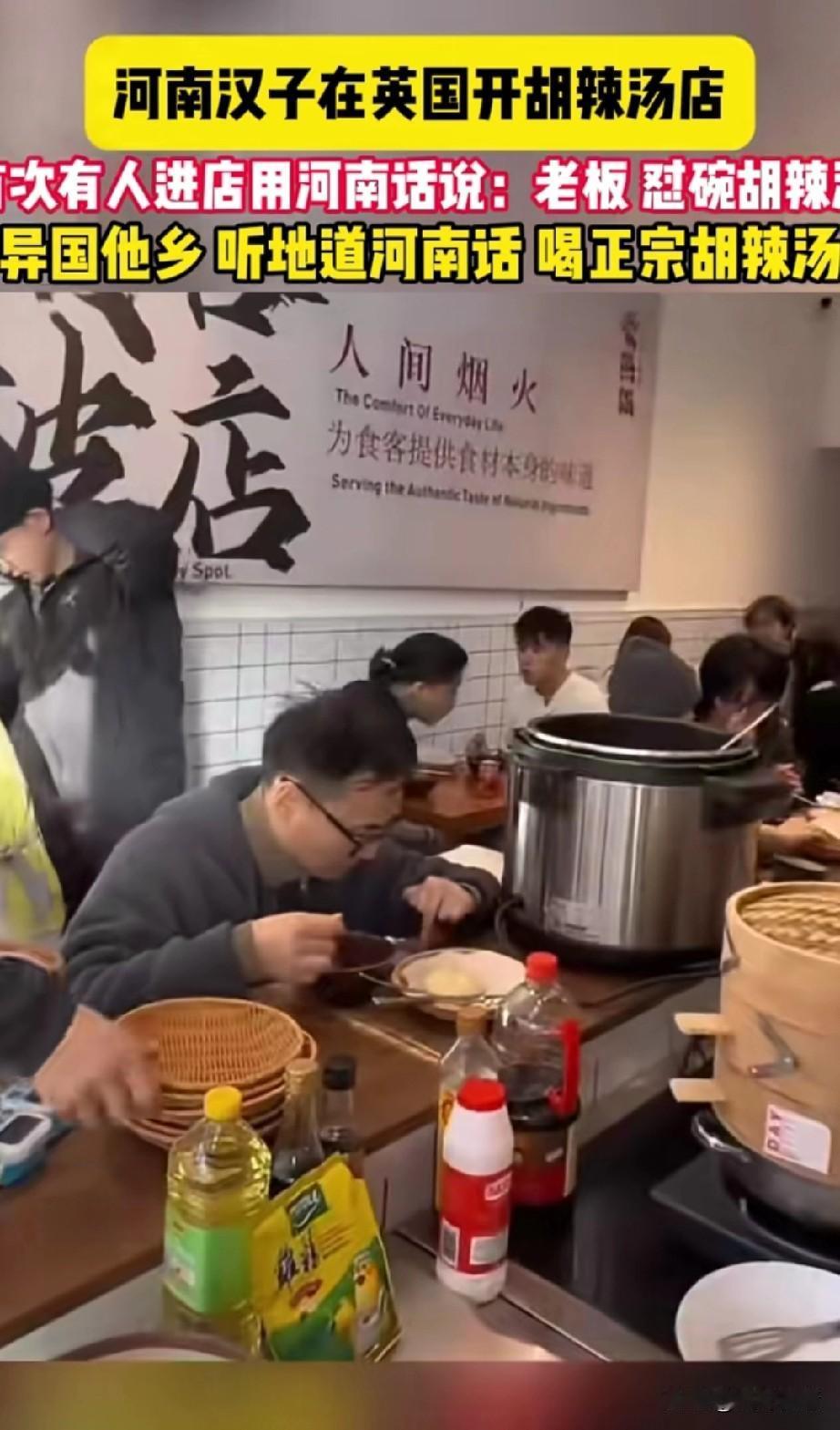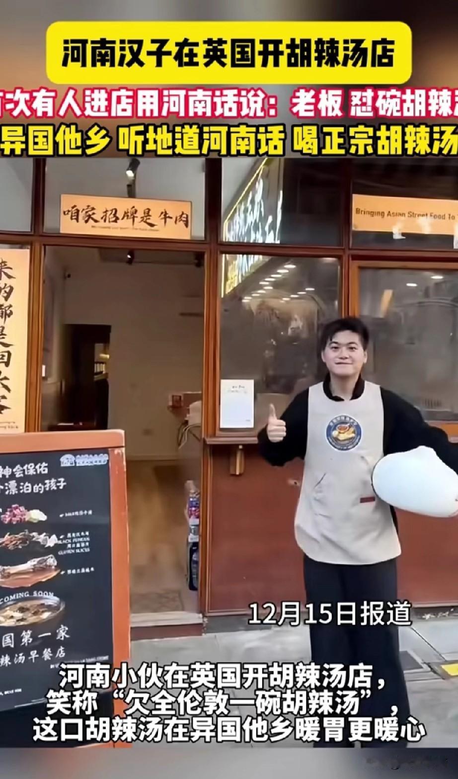 河南汉子在英国伦敦开了一家胡辣汤店,每天都是用最新鲜的食材, 精心熬制而成, 没想到开业当天即爆火, 有很多的老乡来这里喝胡辣汤, 除此以外,当地的年轻人也来光顾, 于是出现了拿着杯子在泰晤士喝胡辣汤,中国美食果然厉害, 一出国就火爆, 在英国伦敦能遇到老乡, 该男子也是非常开心, 毕竟远在千里之外, 有老乡来喝胡辣汤他非常欢迎, 他希望把河南的胡辣汤, 能够在伦敦火出圈, 胡辣汤再配上地道的小笼包, 那可真的是一绝, 伦敦人以前就很喜欢吃包子, 再加上胡辣汤, 味道简直把他们都征服了, 老外都说喝的好喝, 大家对于河南汉子在伦敦开胡辣汤店怎么看? 河南辣汤 逍遥豫尚胡辣汤 韩集胡辣汤 豫见牛肉胡辣汤 印度胡辣汤 伦敦胡私厨 韩国辣汤