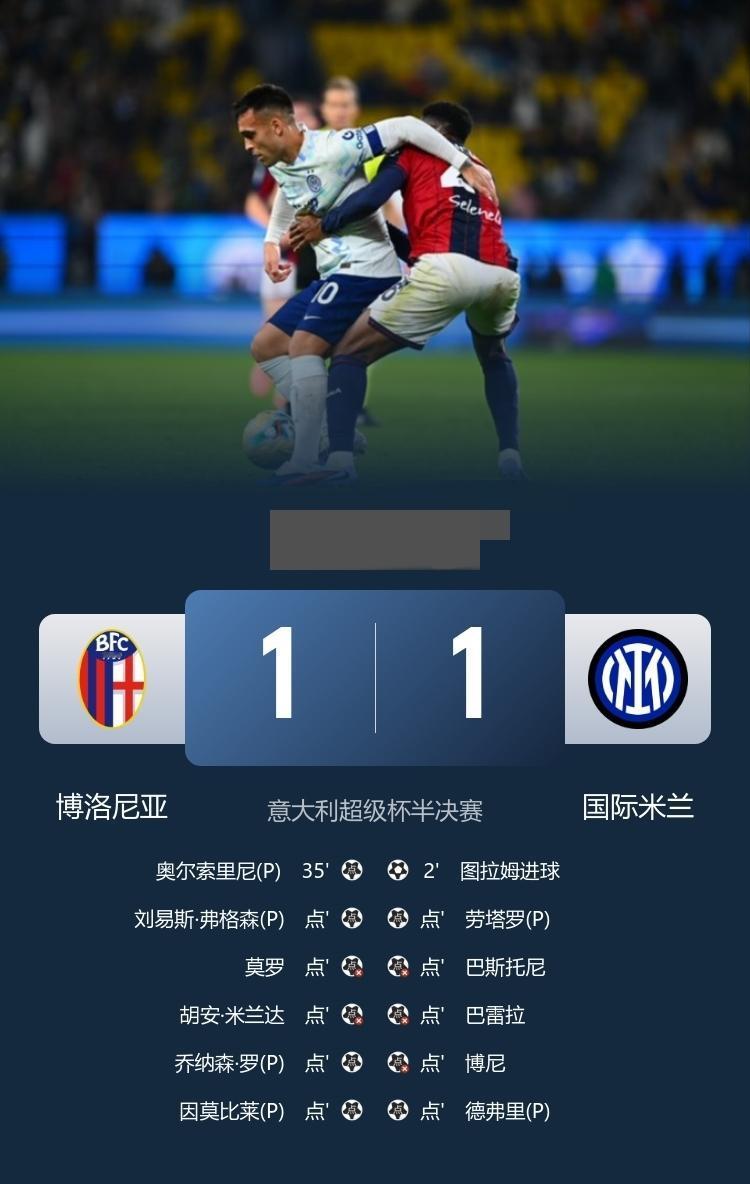 意超杯-国米1-1点球2-3不敌博洛尼亚无缘意超杯决赛 巴斯托尼 巴雷拉 博尼失点 12月20日 意大利超级杯半决赛,博洛尼亚对阵国际米兰。上半场,小图拉姆闪击破门,奥尔索里尼点射扳平。下半场,双方均无建树。最终,常规时间国米1-1博洛尼亚,双方点球大战国米2-3不敌博洛尼亚,博洛尼亚进入决赛将对阵那不勒斯