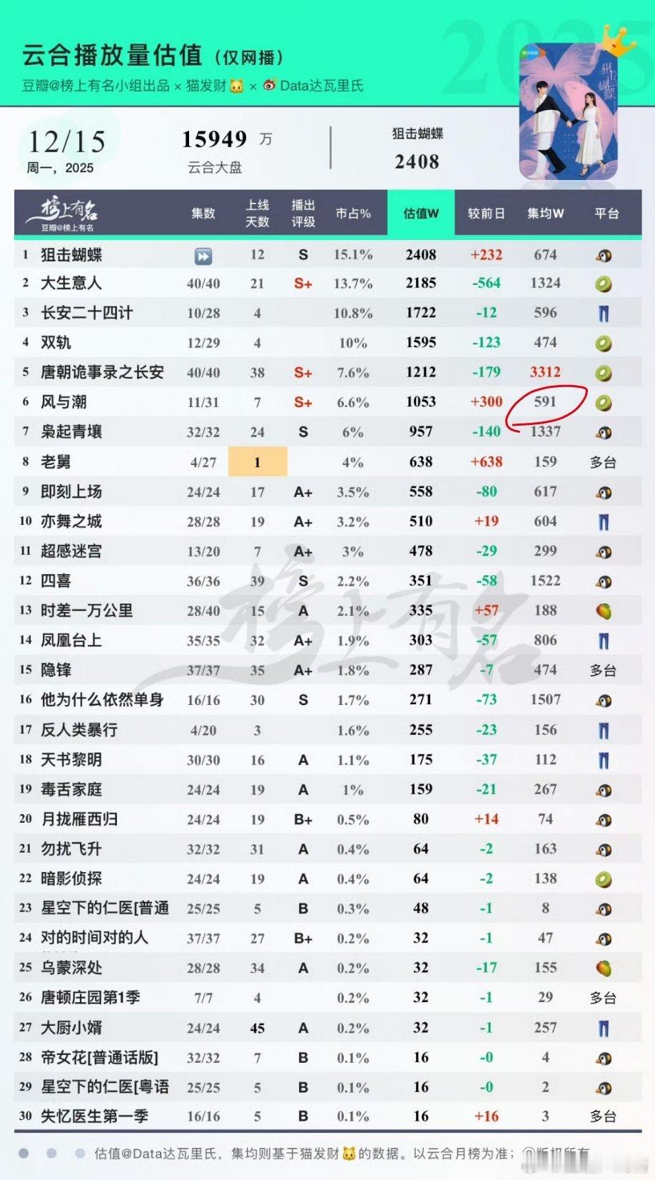 任嘉伦《风与潮》血扑了,云合集均1000都不到