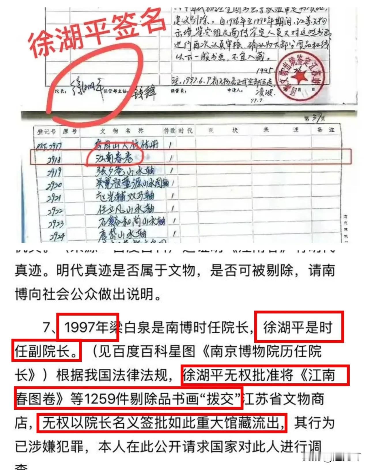庞叔令开始点名道姓了。 徐湖平,这个名字一出现,大家的目光都聚焦过来。他可不是一般人,曾任南京博物院院长,还享受国务院特殊津贴,这样的身份和地位,足以让他在文博界风生水起,甚至可以说是德高望重。 可是,近几日的一次公开发言,却让他陷入了舆论的漩涡。庞叔令在一次采访中,直接点名徐湖平,称他在1997年南博申请划拨“不够馆藏标准”的文物时,正以院长身份主持工作,作为法人代表,对文物处置决策负有不可推卸的责任。 而徐湖平对此的回应却让人匪夷所思,他竟然表示自己已经80多岁了,早已不参与外面的事情,这件事也不是经过他的手,他根本不是书画鉴定家,这样的回答,无疑是在推卸责任,让人对他的态度产生质疑。 大家都知道,徐湖平在文博界深耕几十年,编著过数十部学术著作,怎么可能突然就变得对一切都“不知道”了呢?更何况,他还曾当选福布斯东方大国杰出文化人物,这样的荣誉和成就,足以证明他在文博界的地位和影响力。 还有一件让人感到匪夷所思的事情,那就是当年被南博定为“伪作”的《江南春》,竟然在2001年以6800元的价格卖给个人,如今却以8800万的价格现身拍卖市场,这其中到底发生了什么?相信很多人都想知道真相。 现在,江苏省文旅厅已经成立专班调查,承诺依法依规处置此事,公众所期待的就是一个公正、透明的调查结果,而不是像徐湖平这样“卖惨推诿”的态度。 文物是国家的瑰宝,每一件都是前人智慧的结晶,而捐赠人更是怀着对祖国和民族的热爱,将珍贵文物无私奉献出来,他们的善意和付出绝不该被辜负,也希望相关部门能够认真对待此事,还原真相,还给公众一个交代。 大家对此事件有什么看法呢?欢迎在评论区留言讨论。