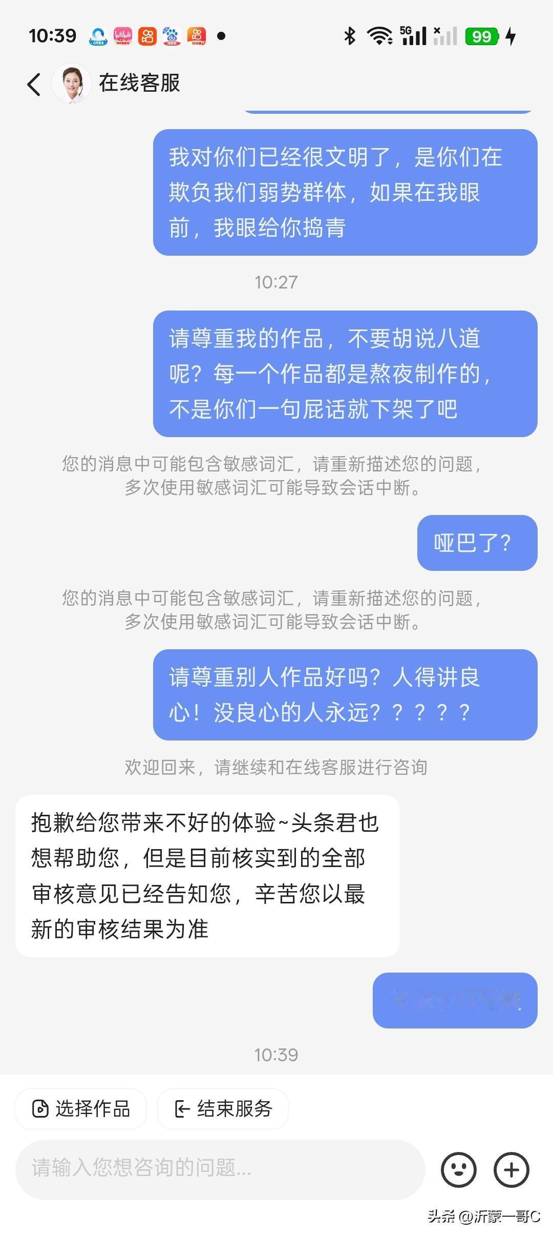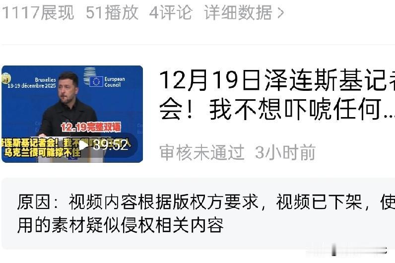 我版权谁来?无缘无故给我作品下架?熬夜制作不易,也没有说明就给我下架,说是存在风险,这是泽连斯基的现场讲话,头号是怕谁啊?好好的视频就下架?欺负我们弱势群体,头条平台嘴怎么大?大家遇到过这种情况吗?欺人太甚!