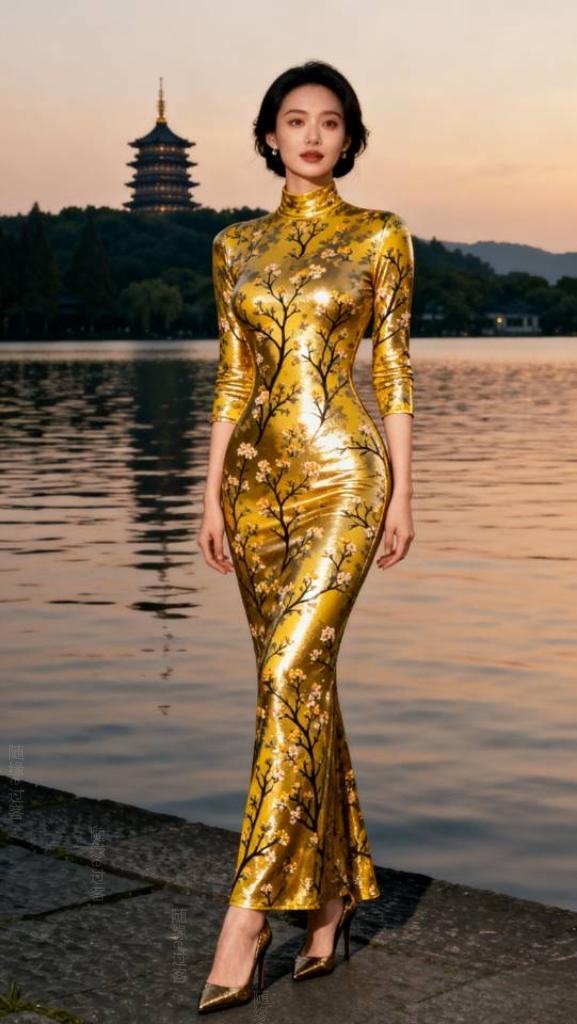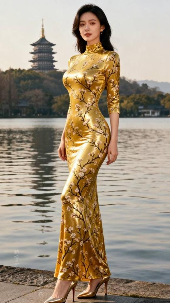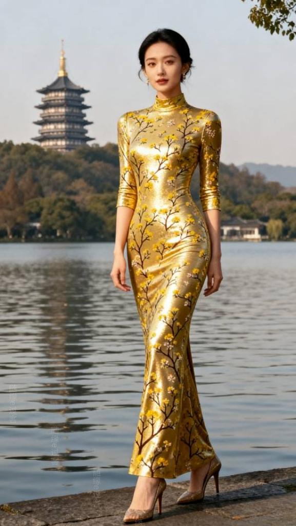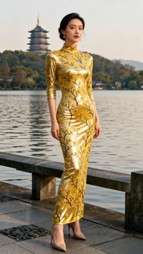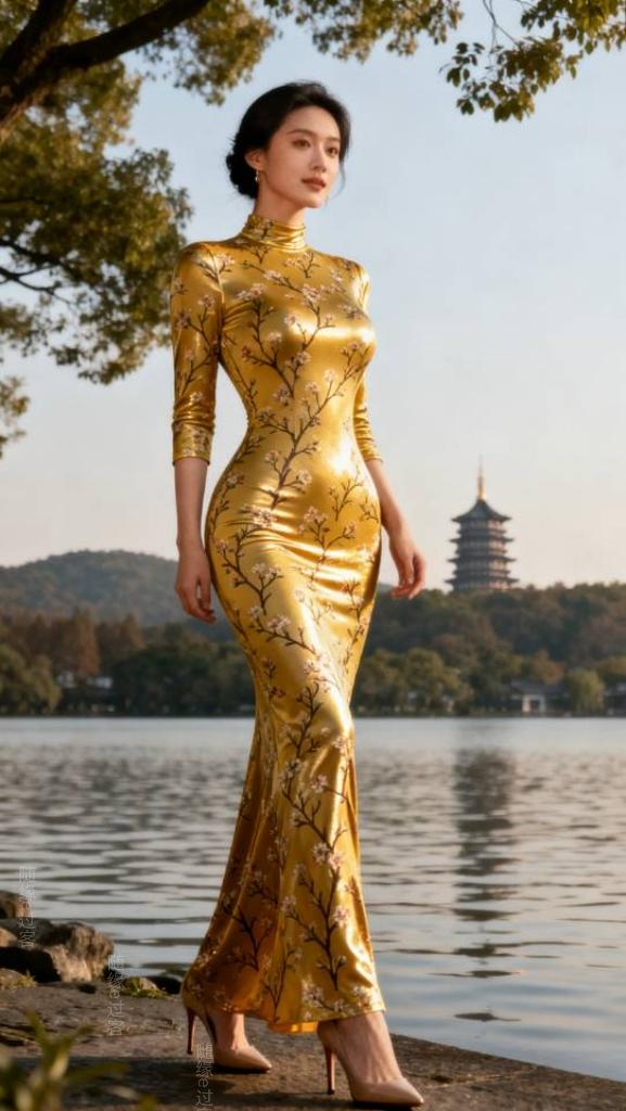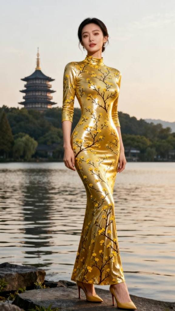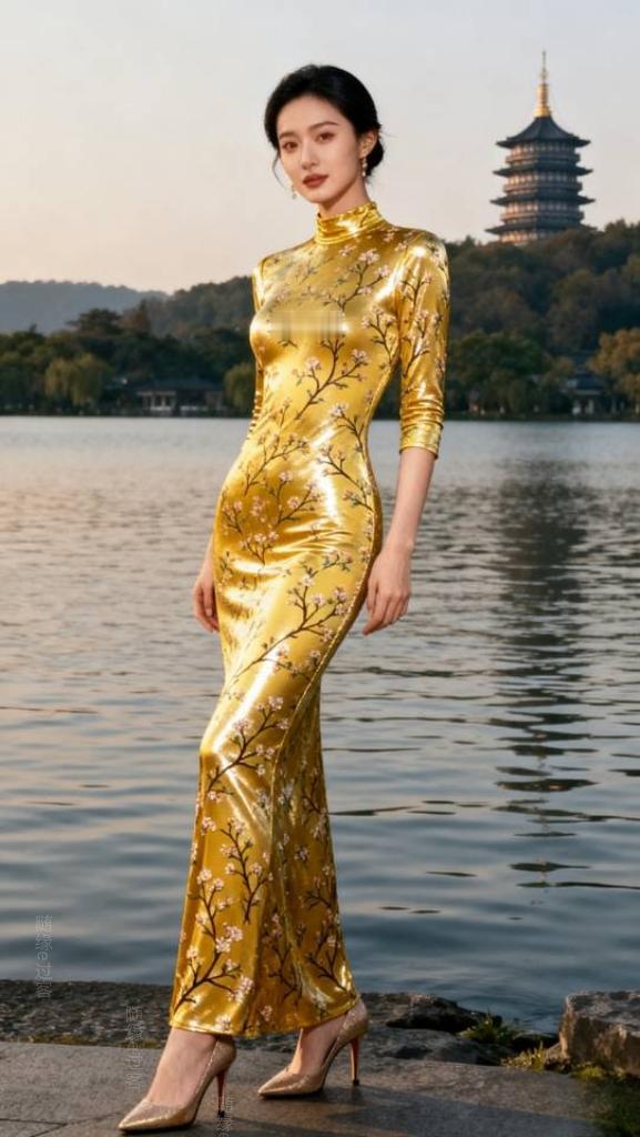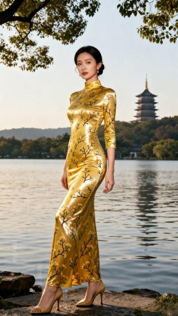 黄色旗袍裙女子在杭州西湖旁留影。旗袍旗袍美女