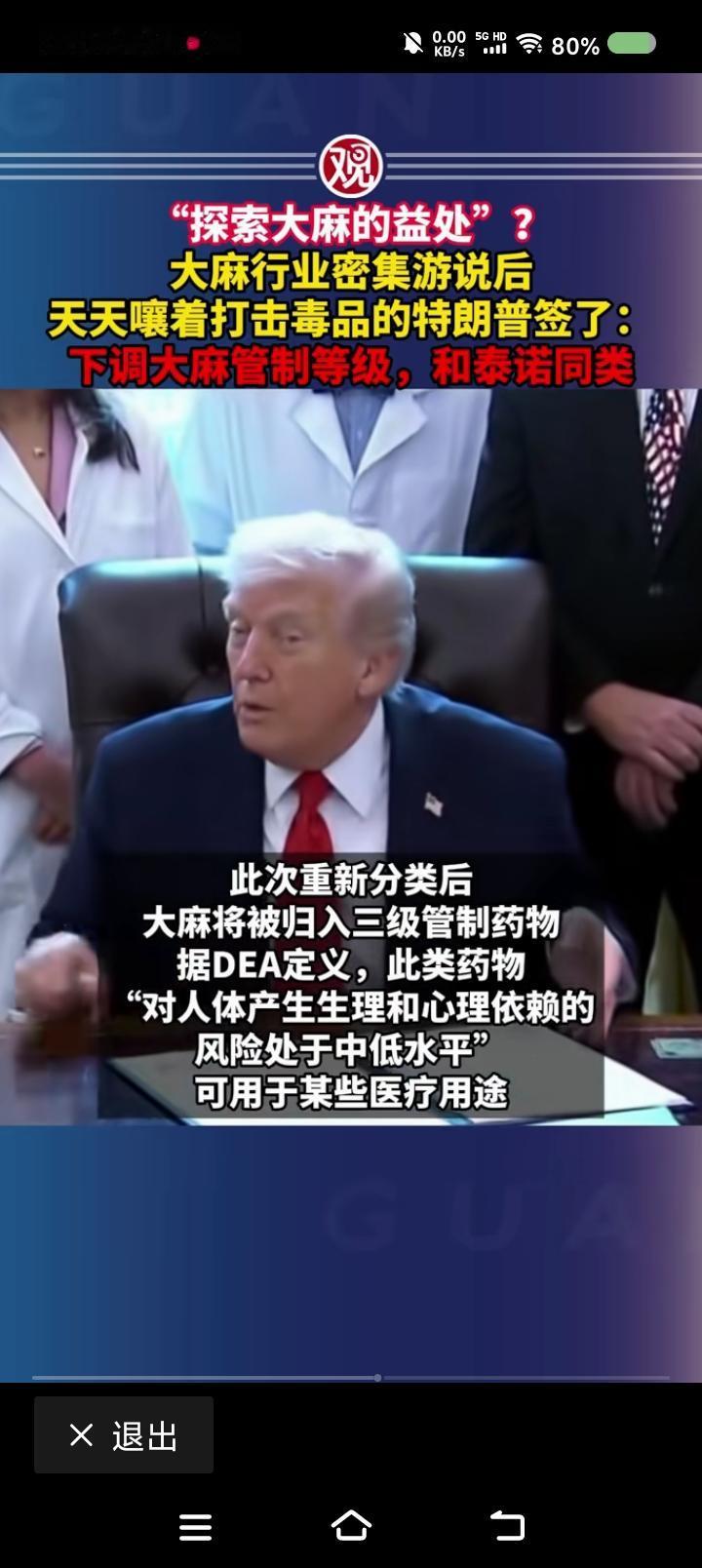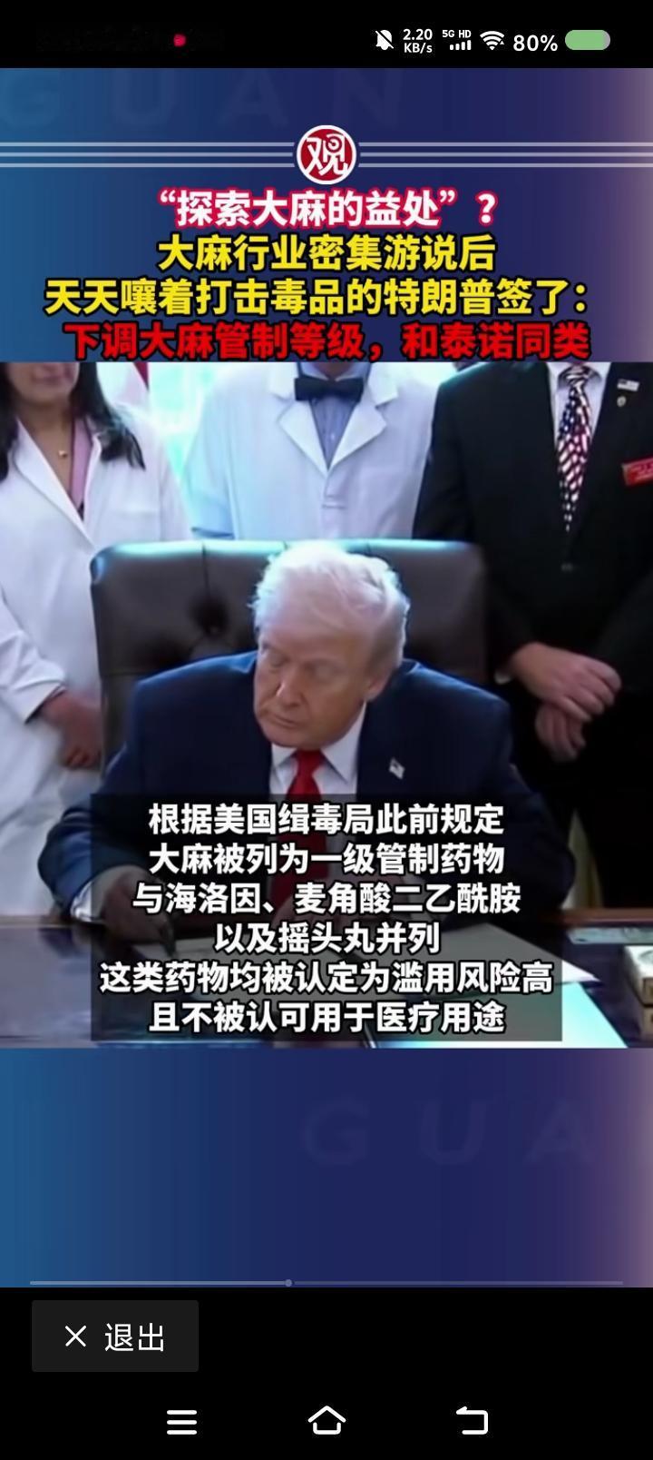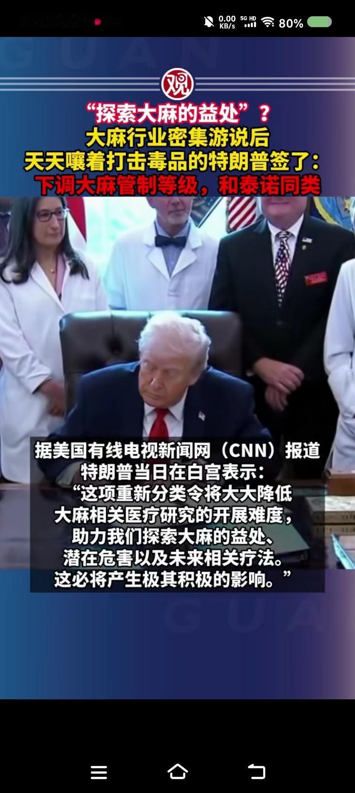 特朗普,你能有点出息么?—— 据报道,经游说,特朗普签署命令,将大麻从一级管制药物降为三级管制药物,美国一家媒体赞赏这一命令:“有利于医学研究。” 点评: 阿普,委内瑞拉还打不打? 昨天,你还信誓旦旦打击du品犯罪,今天,你下调了大麻的管制等级,这是闹哪样?请问,医学研究不会单独申请么?它与严格管制矛盾吗? 特朗普,你真垮!