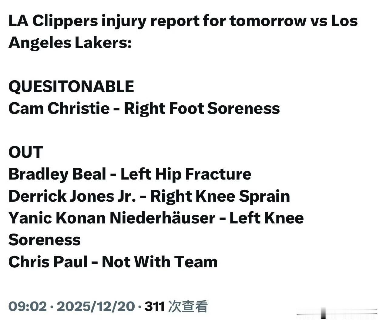 湖人vs快船比赛预告!!!哈登复出战湖,比赛预测快船仍不被看好! 北京时间12月21号明天上午十一点半,湖人将做客同城洛杉矶,挑战快船队,德比大战将再次上演,一起来看下比赛预告吧! 湖人伤病情况: 里夫斯、艾顿和文森特已经确定不打了,八村出战成疑,布朗尼在发展联盟打球不会回来。 快船伤病情况: 哈登将在这场比赛复出,小琼斯、比尔、尼德豪泽都确定不打,而保罗也继续不会跟随球队出现。 目前从ESPN给出的预测结果来看,湖人有略高于五成的胜率拿下比赛,和快船差距不大,这才是应该有的正常比例吧。 而且目前快船主场+3.5,毕竟哈登和伦纳德都在,双方就要看临场的发挥了。 目前快船已经在风口浪尖,他们一路连败,几乎看不见胜利,本场比赛对他们至关重要,但是湖人也不会把胜利拱手相让,大战一触即发!我的2025年度总结湖人 快船 哈登