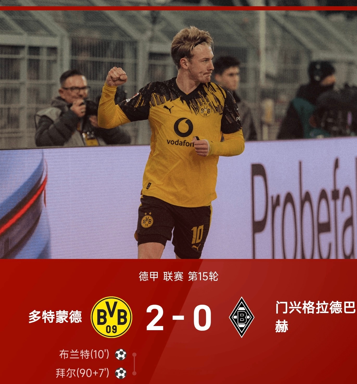 12月20日讯 25/26赛季德甲联赛第15轮焦点战,普鲁士德比在威斯特法伦球场打响,多特蒙德凭借布兰特与拜尔的进球,以2-0干净利落地击败门兴格拉德巴赫。 比赛进程跌宕起伏,聚勒右路精准传中助攻布兰特禁区前沿劲射破门,为多特先拔头筹。门兴前锋吉拉西曾头球破门,但因越位在先被判无效;随后拜尔在禁区内倒地,主裁判未予理会。错失单刀良机的拜尔没有气馁,终场读秒阶段完成致命一击,将功补过锁定胜局。此役过后,多特蒙德凭借这场胜利,先赛一轮暂时攀升至德甲积分榜第二位。