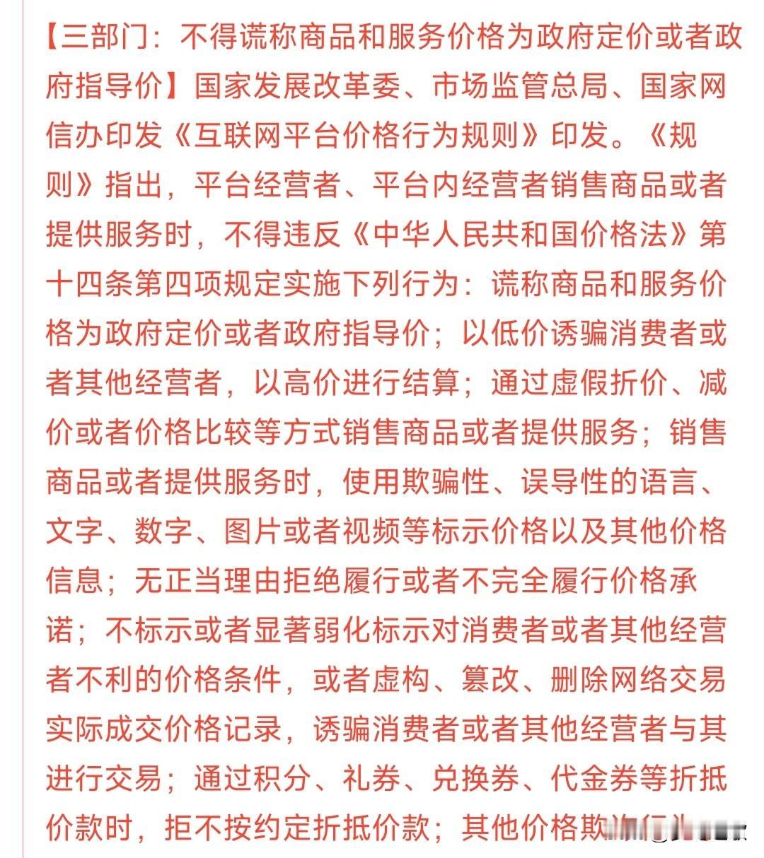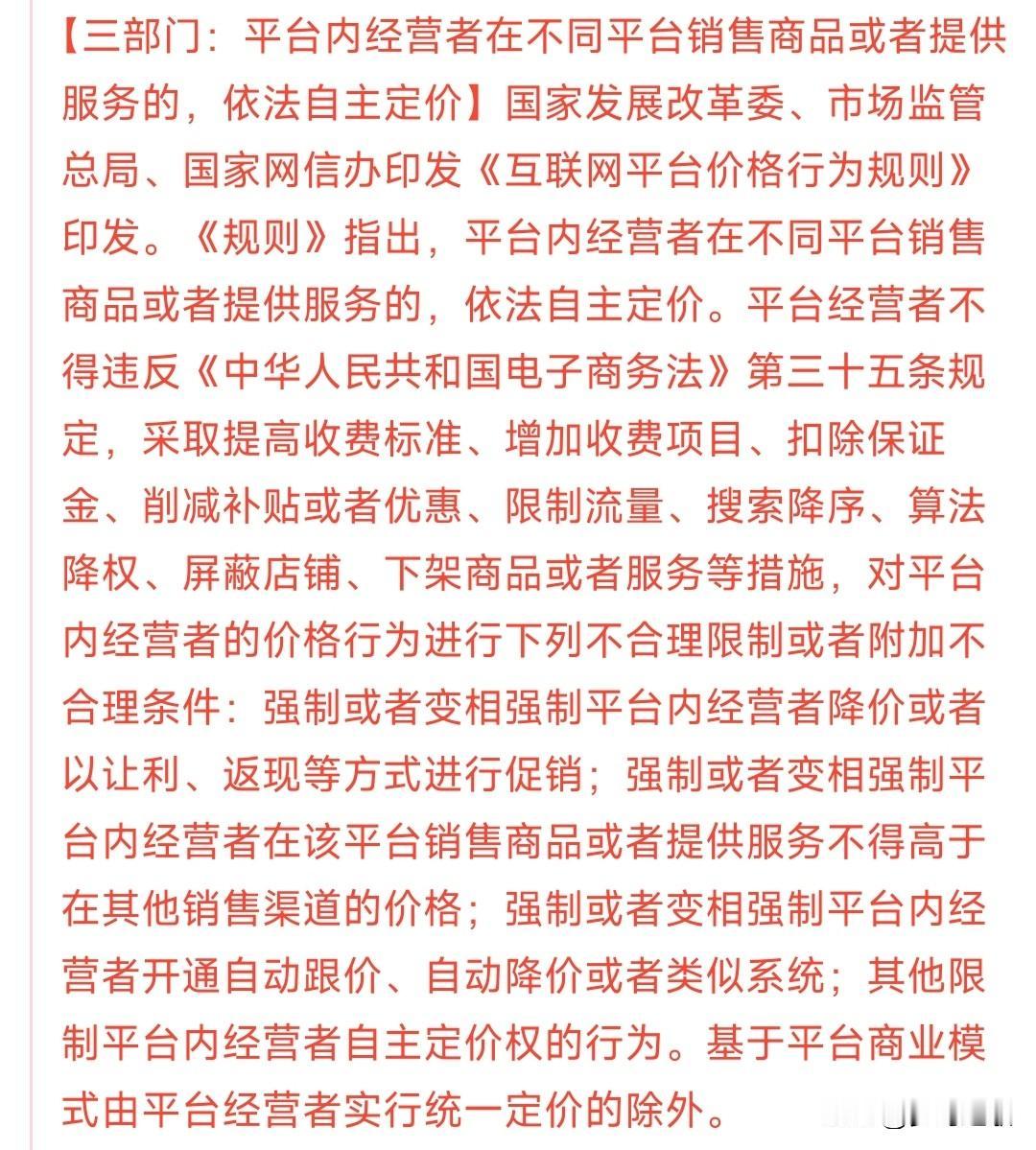 实体店终于有救了,互联网电商的价格整治来了 说实话,自从电商发展起来实体店就不好干了,因为电商不用租场地,天然的成本就低,同样的商品价格就会有优势,实体店就不行。 《互联网平台价格行为规则》出台就是为了控制恶性竞争和价格竞争,对于消费者和实体店来说是一个翻身的机会 对消费者:价格透明,避免大数据杀熟,虚假宣传和打折 对实体店:遏制电商平台用低价倾销、补贴烧钱挤压线下。价格平等后还能体验线下服务,避免虚假宣传的情况。 这次的互联网整治最后就是让消费者买的明白,让商家赚的合规。