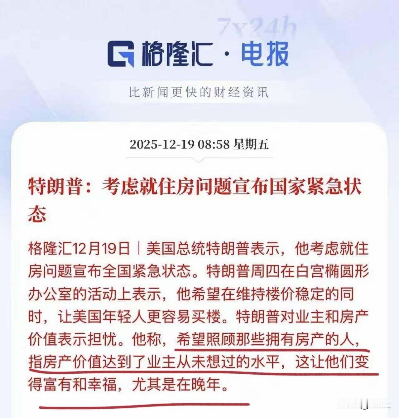 根据格隆汇电报, 特朗普于2025年12月19日(星期五)发表声明,称其正在考虑就住房问题宣布国家紧急状态。 他说在维持楼价稳定的同时, 让美国年轻人更容易买房, 并希望照顾到那些因房产价值飙升而变得富有和幸福的业主。