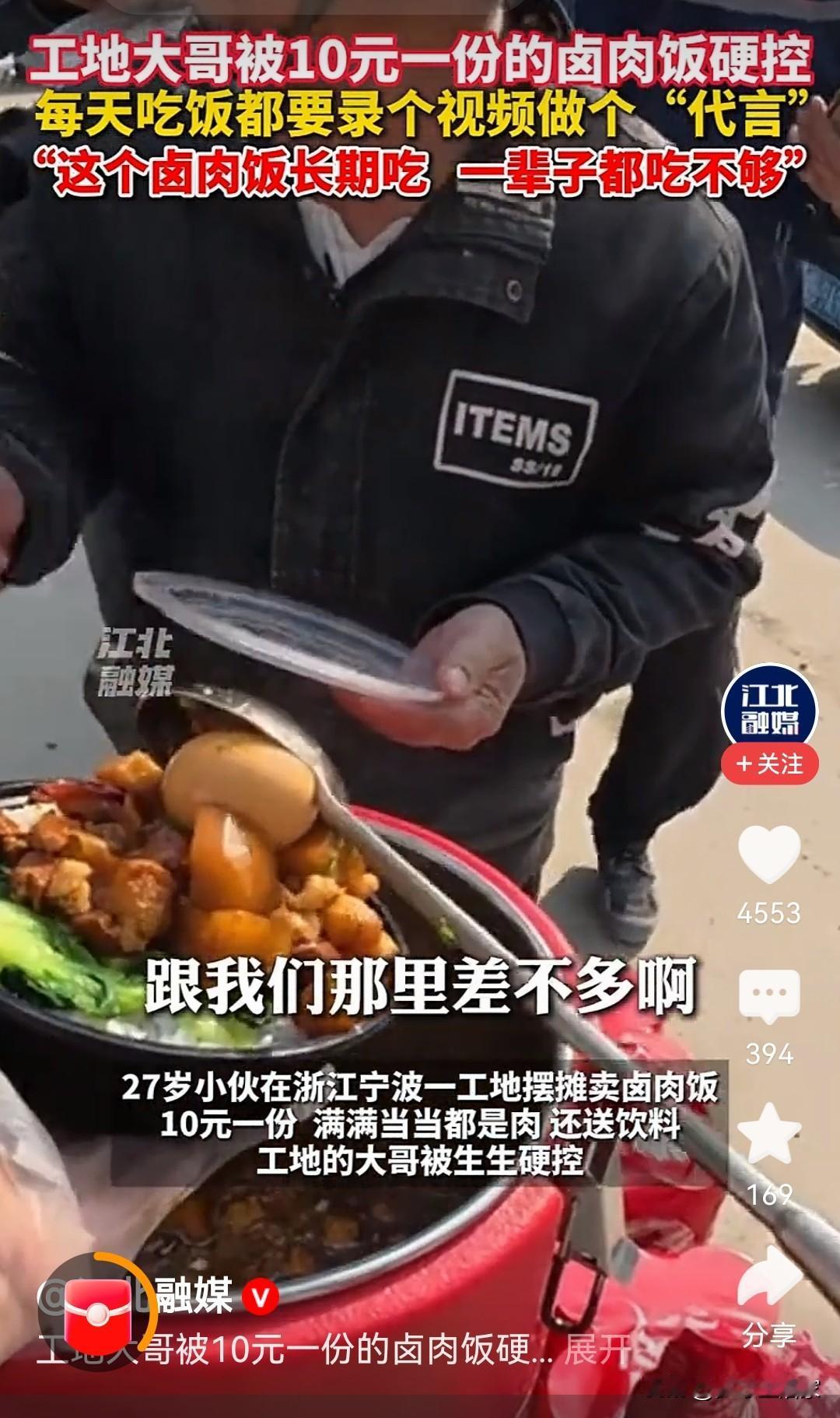 这卤肉饭也真是没谁了, 就说现在猪肉7块钱一斤,鸡蛋2块多,再送饮料,这妥妥的硬核卤肉饭。 看着城市建设者大碗吃肉,摊主打饭手也不抖,真是祥和的就餐时光。 货真价实的具象化,估计也只能这样了。 工地大哥就需要实惠,为这摊主点赞👍👍👍。