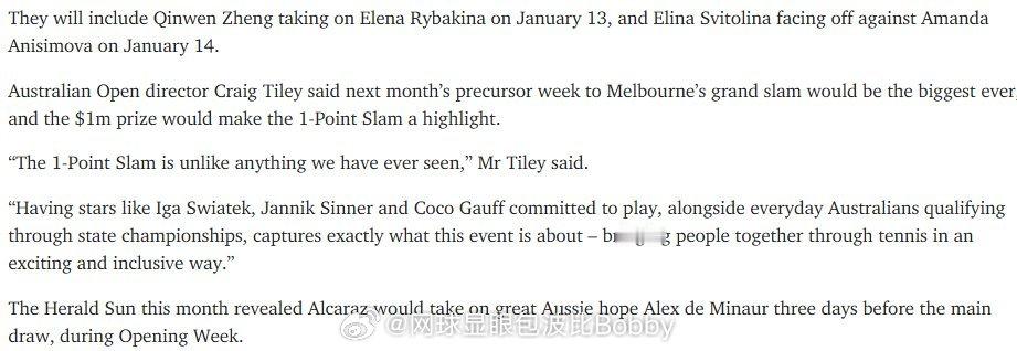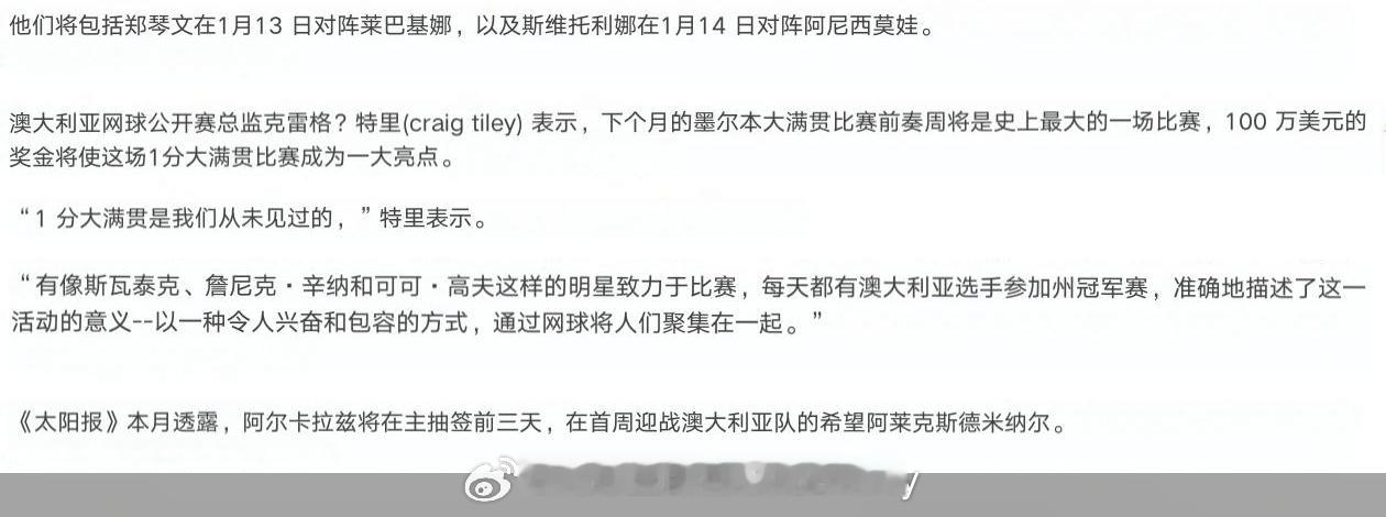 号外,号外📢郑钦文1月13日复出据《先驱太阳报》报道,郑钦文和莱巴金娜2026年1月13日在墨尔本会有一场表演赛网球talking大会郑钦文莱巴金娜将打表演赛 郑钦文的郑在进行时wta