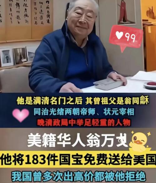 把国宝捐给美国竟被称有远见!明明是数典忘祖,却说文物无国界!把自己“卖国求荣”的行为,强行挂了个“保护文物”的雅称! 最近刷到一些讨论翁万戈的声音,实在让人跌破眼镜。 让人刺耳的是,这些人还把翁万戈当年那句话当成了至理名言,仿佛把国宝送出国门才是对文物最好的归宿。 作为两代帝王之师,翁同龢凭借显赫的地位和独到的眼光,不断扩充藏品,让翁氏家藏成为当时数一数二的私人收藏。 历经六代人苦心经营,这份收藏里不仅有沈周、文徵明这样的名家珍品,更有不少填补历史空白的古籍善本,每一件都承载着中华民族的文化基因,是货真价实的国之瑰宝。 作为家族选定的继承人,翁万戈肩负起了守护文化遗产的责任,只是这份责任最终被他引向了截然不同的方向。 为了顺利通过海关检查,他还忍痛放弃了容易引人注目的古董器物,只挑选外国人看不懂的书籍字画和文房四宝装箱。 经过数月的海上航行,这批国宝抵达美国,从此开始了长达数十年的海外漂泊。 从2008年开始,他就陆续向波士顿美术馆捐赠文物,十年间累计捐赠21件重要藏品,到了2018年更是一次性无偿捐赠183件,这批藏品价值高达10亿美元,其中就包括国内文博界苦苦寻觅的《长江万里图》。 国内各大博物馆都配备了专业的恒温恒湿储藏设备、先进的文物修复实验室,还有一支高素质的专业保护团队,无论是硬件设施还是技术水平,都达到了国际先进水准。 那些诞生于中国土地上的艺术珍品,只有在孕育它们的文化土壤里,才能真正发挥其历史价值,被更多国人了解和珍视。 这些年,中国一直在努力追回流失海外的文物,无论是通过法律途径追索,还是通过公益拍卖回购,每一次成功都凝聚着无数人的心血。 从圆明园兽首的陆续回归,到海外流失文物的批量追索,背后是国家实力的提升,更是对文化遗产的珍视。 在这样的背景下,再回头看翁万戈的捐赠行为,那些所谓的远见和格局,就显得格外刺眼。 如今翁万戈已经离世,但关于这批国宝的争议从未停止。 那些被捐给美国的183件珍品,依然在异国他乡的展厅里陈列,向世人展示着中国古代艺术的魅力,却也默默诉说着一段让国人唏嘘的往事。 那些夸赞他有远见的声音,无疑是对无数为文物回归奔走的人的伤害,更是对民族文化传承的漠视。 对于这件事,您有什么想说的吗?欢迎评论区留言讨论。