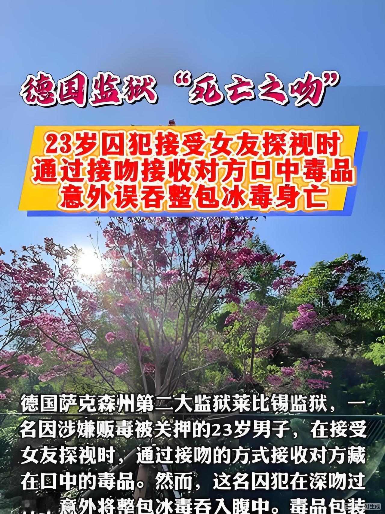 致命之吻!女子探监舌下藏毒,拥吻递毒竟致男友狱中暴毙 2025年初德国莱比锡监狱曝出惨剧,一场探监时的拥吻,直接酿成了一出“死亡之吻”的悲剧。24岁女子劳拉为狱中男友藏毒递毒,最终导致23岁男友穆罕默德毒发身亡,两人3岁的女儿就此失去完整家庭,只留终身遗憾。 穆罕默德本就因涉嫌贩毒处于审前拘留,却仍不思悔改惦记着毒品。劳拉为满足男友需求,将数克冰毒用锡纸裹成圆球藏在舌下,成功躲过监狱安检进入探视区。二人见面后借着拥吻交接毒品,没曾想穆罕默德一时失手,直接把整包毒品吞进了肚子里,他明知是毒丸,却没料到这一口会成为催命符。 探视结束仅一小时,穆罕默德就出现了严重的毒品过量症状,狱友见状赶忙劝他就医,可他还心存侥幸,想着能把毒丸完整排出,硬是拒绝了帮助。等到次日清晨,狱警发现他早已昏迷不醒,急救医生虽暂时挽回他的心跳,却拦不住锡纸被胃酸腐蚀破裂,大量冰毒外泄引发的致命心脏骤停,当天下午穆罕默德便宣告死亡,尸检显示其体内毒品浓度远超致死量数倍。 当地12月18日,莱比锡地方法院开庭审理此案,劳拉因故意提供毒品、过失致人死亡被起诉,等待她的必将是牢狱之灾。这起案件不仅暴露了监狱安检的明显漏洞,更警醒众人冰毒的致命危害——仅0.2克就可致死,监狱内的毒品暴利更会让人铤而走险。所谓的为爱铤而走险,不过是拿生命赌前程,最终落得一死一入狱的下场,也给所有人敲响警钟:沾毒即是深渊,一步踏错便再无回头路。