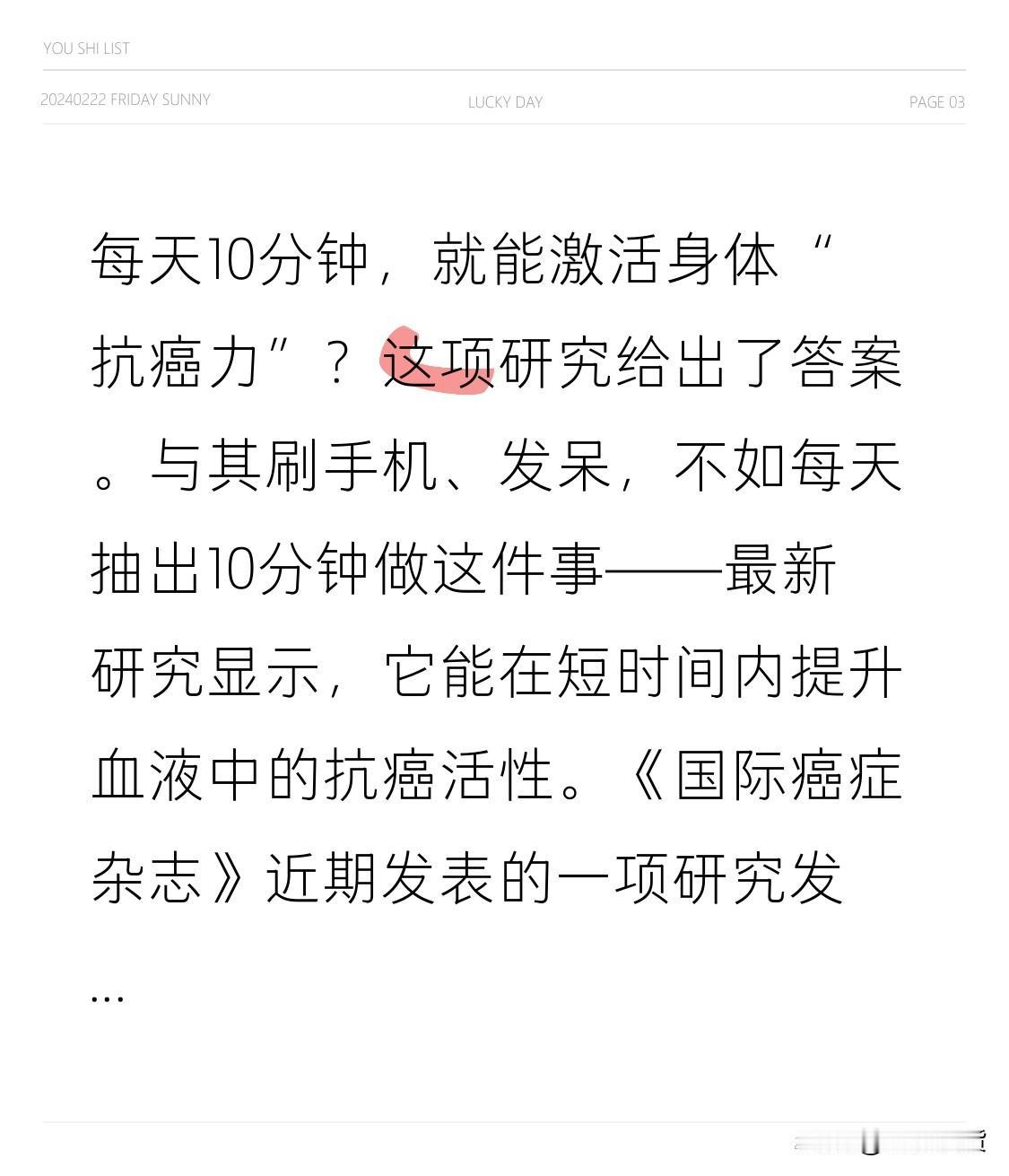 每天10分钟 就能激活身体“抗癌力”? 这小子s是是是这项研究给出了答案。 与其刷手机、发呆,不如每天抽出10分钟做这件事——最新研究显示,它能在短时间内提升血液中的抗癌活性。 《国际癌症杂志》近期发表的一项研究发现,每天只需进行10分钟的高强度运动,血液中就会释放出抑制癌细胞生长的生物活性分子。这种“短时高效”的运动方式,堪称日常防癌的实用策略。 研究指出,运动时肌肉会释放一种名为“肌细胞因子”的物质,随血液循环至全身,不仅能抑制肿瘤生长,还能增强免疫监测功能。即使运动时间不长,只要达到一定强度,就能启动这种保护机制。 适合大多数人的高强度运动包括:快走、慢跑、爬楼梯、开合跳等,关键是要让心率明显加快,感到呼吸急促但仍能断续说话。运动前后别忘了做好热身和放松。 科学运动,贵在坚持。每天10分钟,不仅提升体能,更是为健康做长期投资。 抗癌心得 抗癌治疗方法 防癌技巧 抗癌细胞 抗癌小技巧 癌症自愈力 细胞新陈代谢 每天科学运动十分钟 你平时会通过什么方式活动身体?欢迎在评论区分享你的运动习惯。