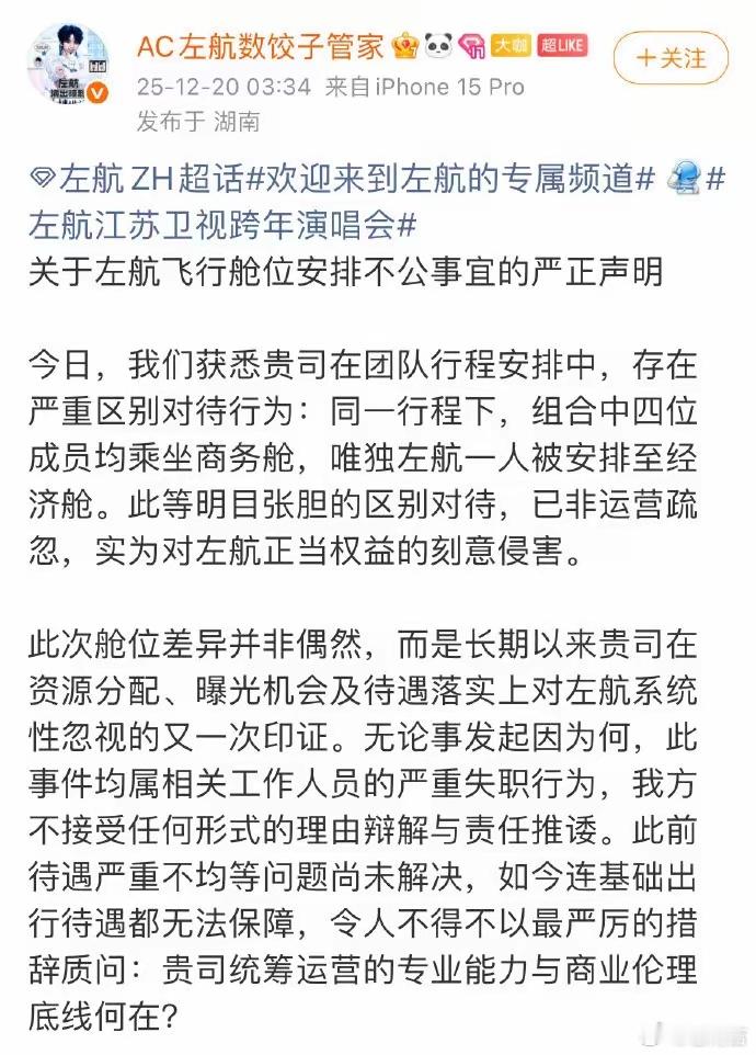 左航坐经济舱全员同机出发,唯独左航独坐经济舱,其他成员均享头等舱待遇,待遇差异一目了然。粉丝怒批团队区别对待,火速集结发起维权活动,要求公司给出合理回应,事件持续发酵引发热议