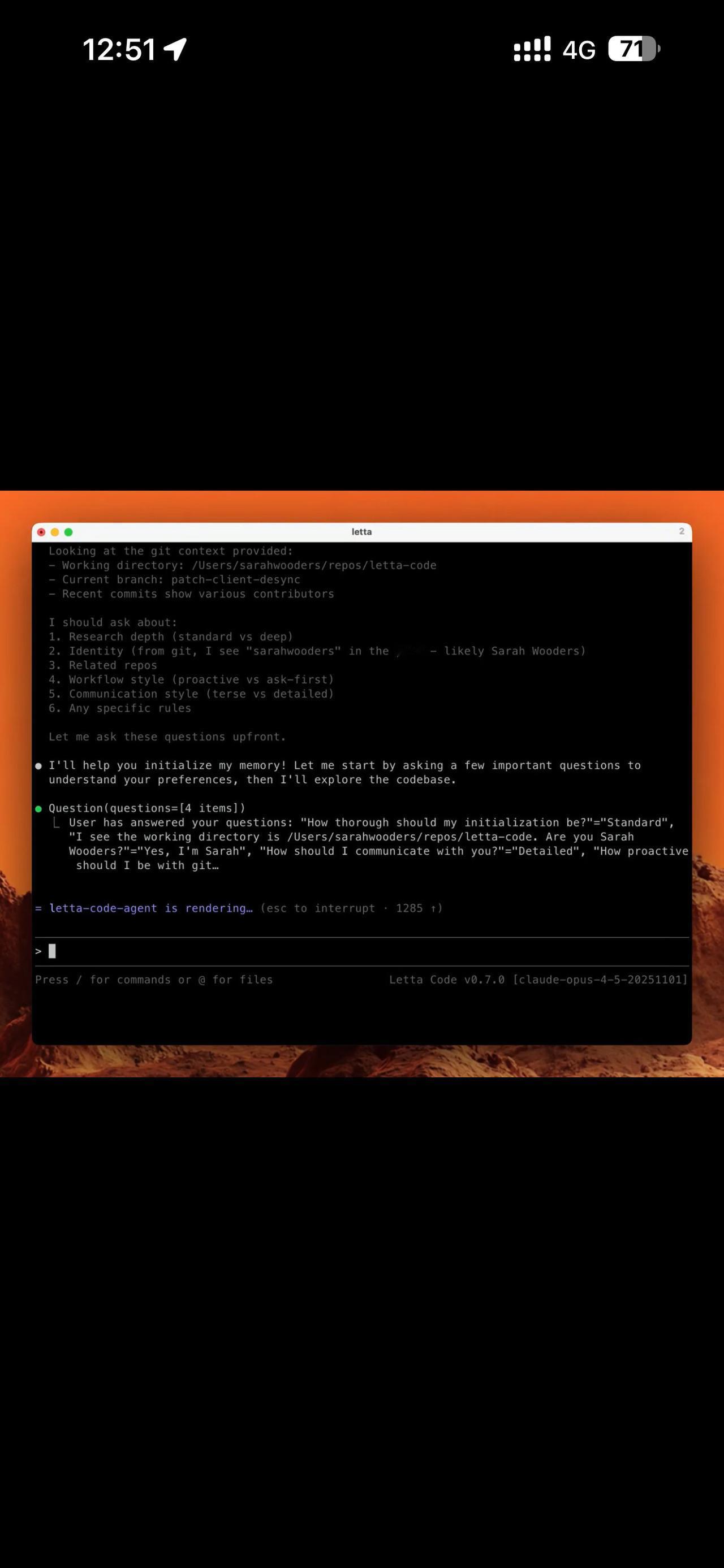 不要立即开始使用新代理进行编码。相反,让它们首先通过以下方式建立上下文: - 对你的代码库进行深入研究 - 优化它们的内存结构 - 学习与反思 运行 `/init` 来为 Letta Code 代理触发此过程 程序员