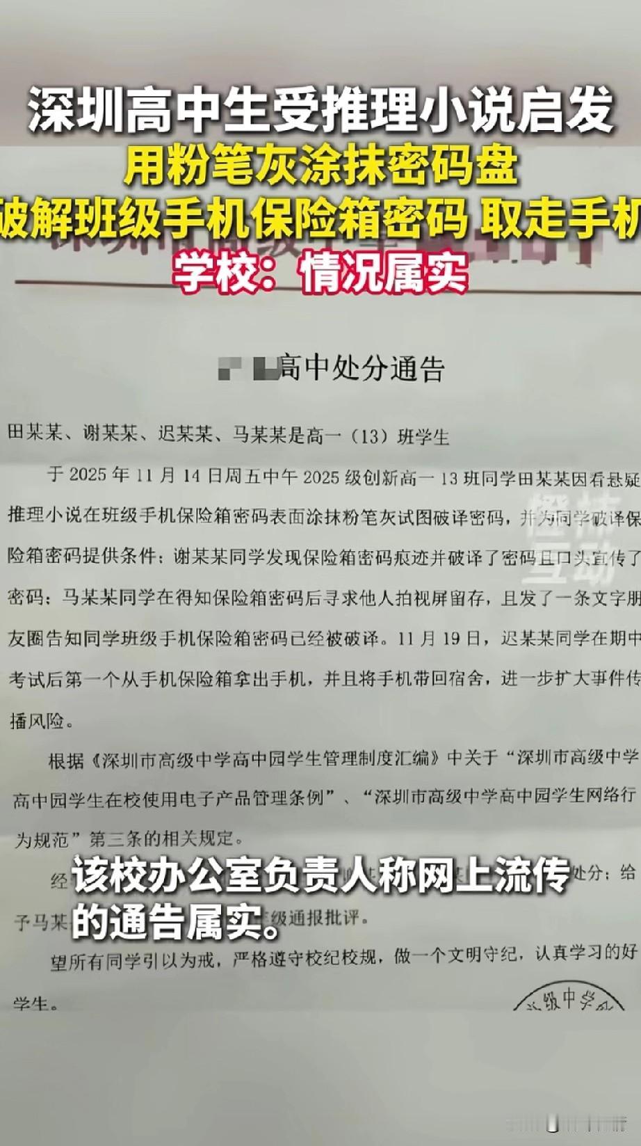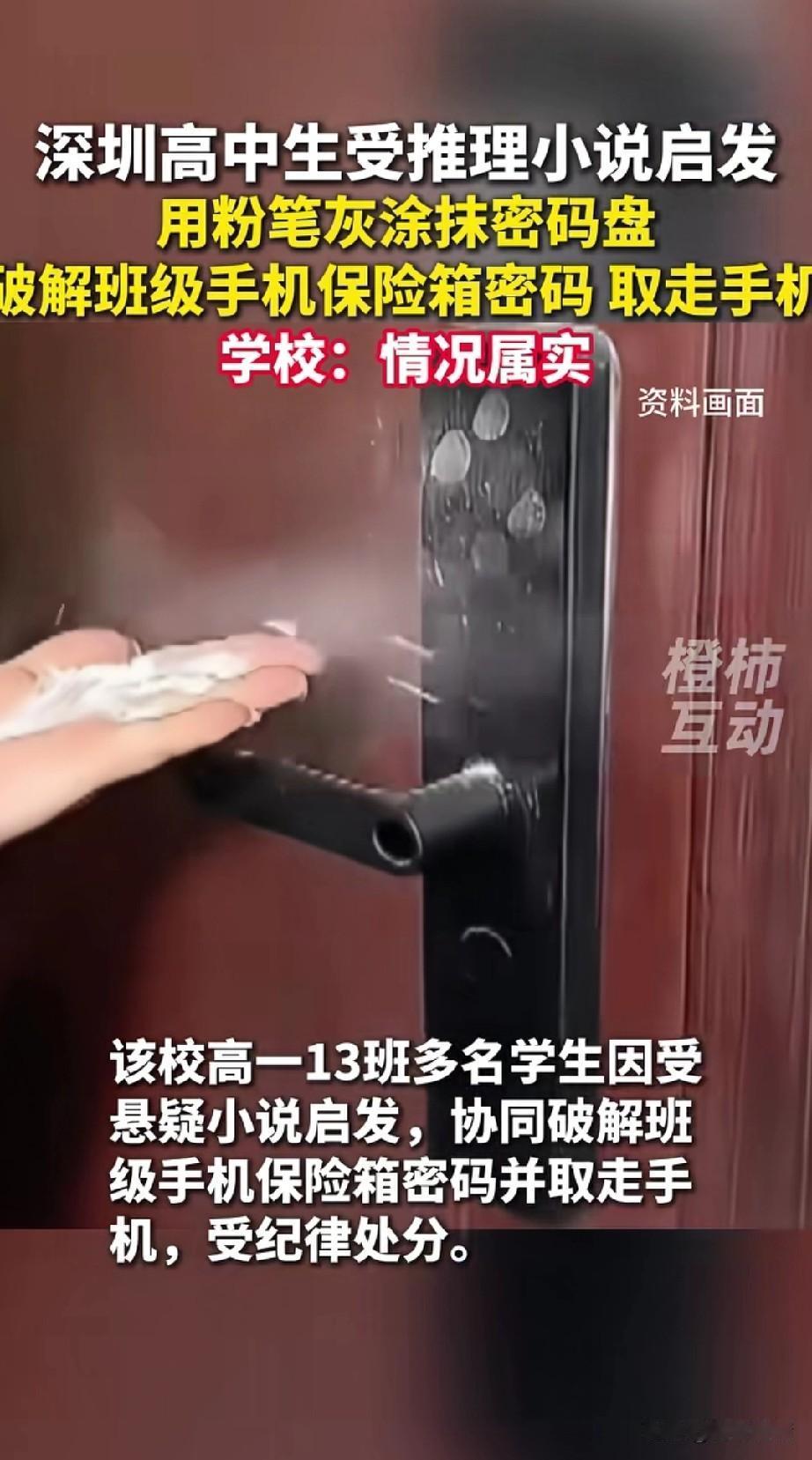这事有点儿太离谱了, 深圳高中生受推理小说启发, 居然用粉笔墨, 多人协同破解了班级手机保险箱的密码,并偷偷取走手机玩耍, 事后居然还炫耀, 将此事拍成视频发在了朋友圈, 让更多的同学看到密码, 果然知道的人越多越容易露馅, 最终被人告诉了老师, 关键是这名学生, 还偷偷将手机拿回宿舍玩耍, 学校知道后非常生气, 于是将共同盗取密码的同学都处分了, 事件一出在网络迅速传播, 有记者向学校核实事情的真假, 学校表示事情属实, 深圳这些高中生还真是聪明, 只是聪明用到了错误的地方, 大家对于深圳高中生用粉笔墨破解密码怎么看? 深圳身边事 初中生藏手机 学生密码本 学生知道的秘密