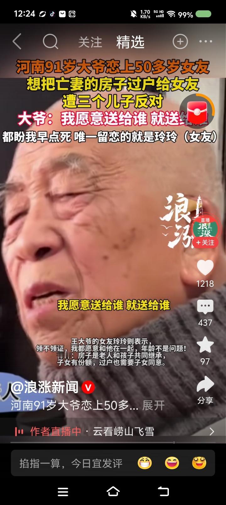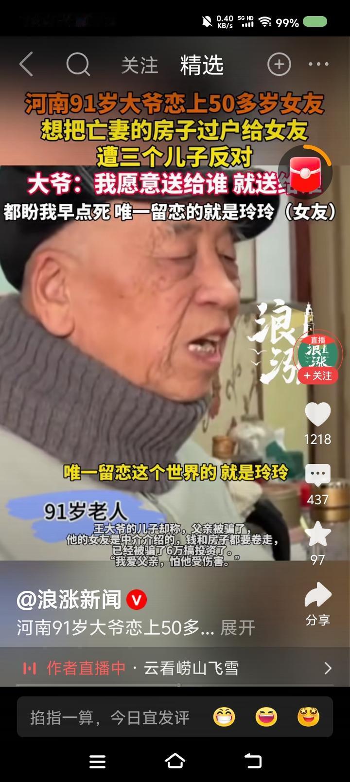 大爷的烦恼—— 据报道,一老人90多了,女友50多岁。老人想把亡妻的房子过户给女友,遭孩子们反对。房子现在的名字是亡妻的,老人想先过户到自己名下。孩子们认为,这女人是中介介绍的,父亲已经花了几万搞投资了…… 点评: 我能说什么? 我说过,人类呀……