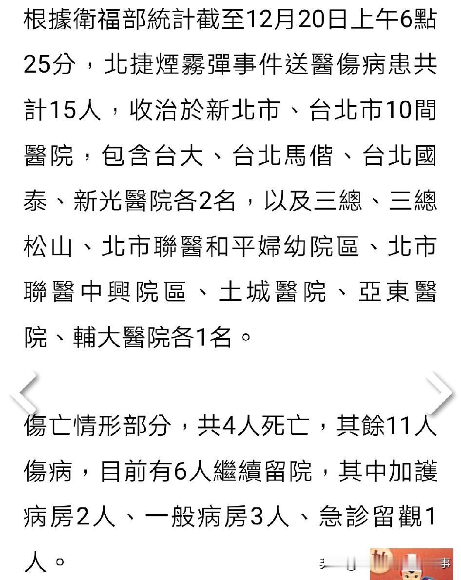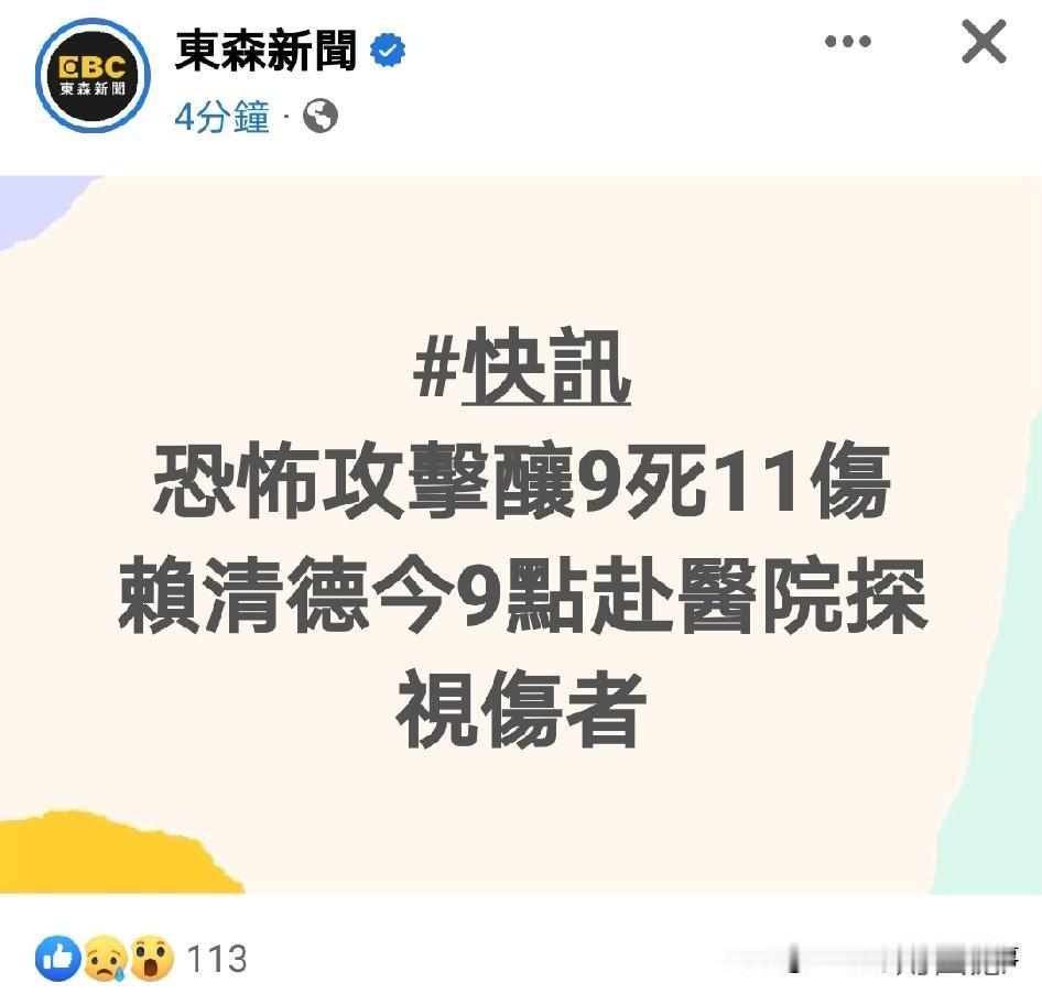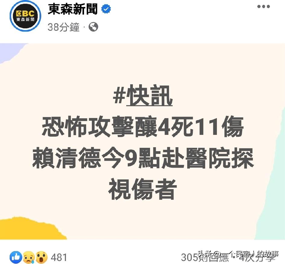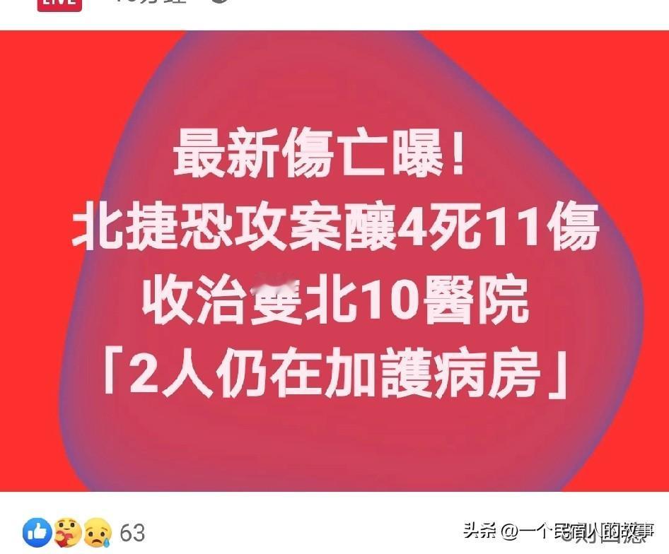 最新:台北砍人案4死11伤。台媒闹乌龙写死9人遭骂。 昨天傍晚发生在台湾省台北市的砍人案,截止今天早上,已造成包括嫌犯在内4人死亡,11人受伤,其中两人还在急救病房。搞笑的是,东森新闻直接写9人死亡11人受伤,被网友骂爆了。 不过大家要是看到绿媒和那些绿网友带节奏,往大陆身上扯,你绝对同情不起来,这时候还在搞政治操作,下作!