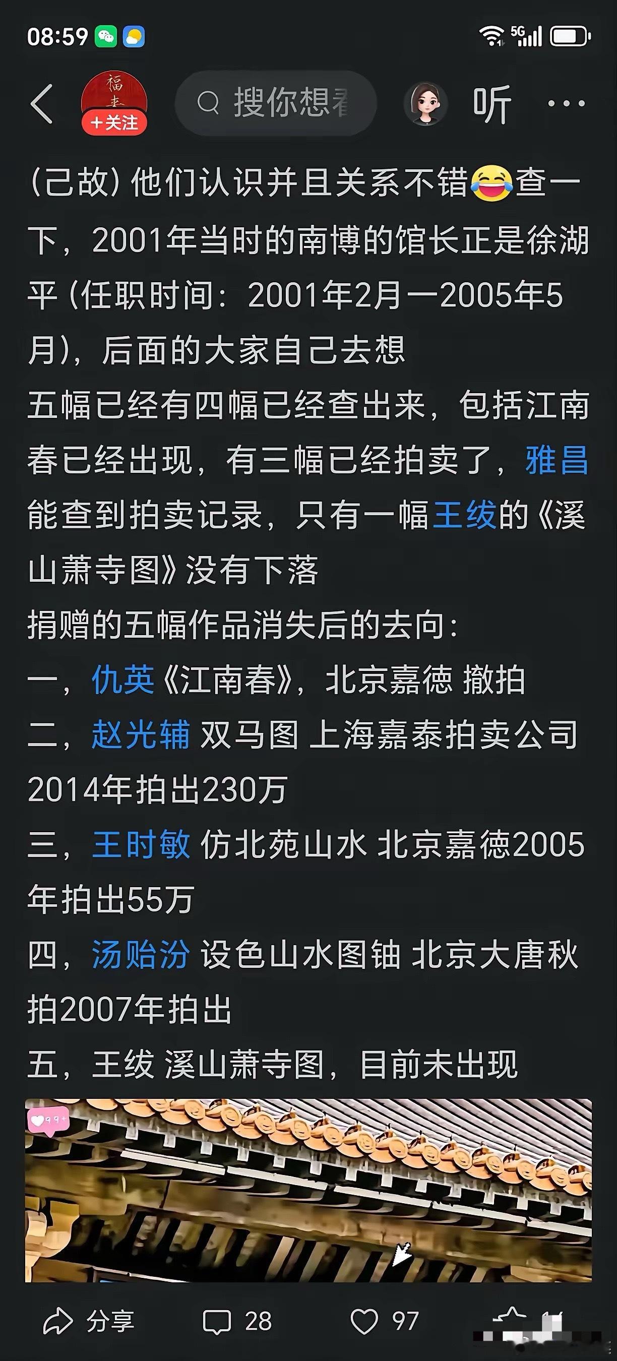网络的力量就是强大,强大到让敌人闻风丧胆!这个大盗已经浮出水面了时任南京故宫博物院的副院长徐湖平这个大盗利用职权,在1995年5月26日南京博物院拨交江苏省文物商店提取了1259件藏品,而文物总店的法人也是徐湖平,后面所发生的事也就顺理成章了。5幅画失踪的画,已有4副有下落了,不过那可是1259件啊?这个家伙太狠了吧?